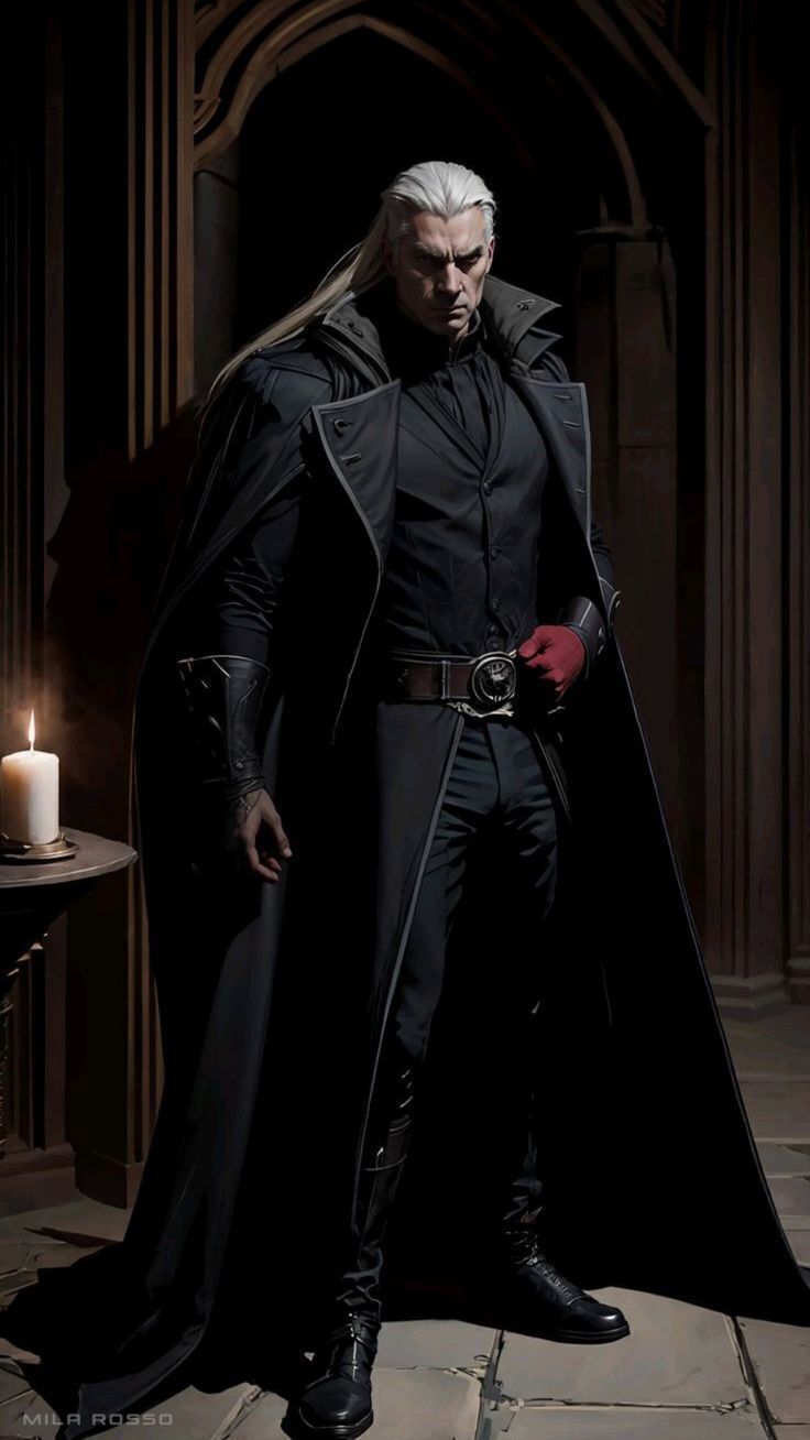 Высокий, одетый в чёрные камзол, штаны и ботинки, с накинутым поверх такого же цвета плащом, седовласый мужик… внушал. Не внешним видом, тут этим мало кого удивишь. Но тяжёлый, пронизывающий до костей и пробирающий до мурашек, холодный взгляд багровых глаз из-под нахмуренных бровей, буквально подавлял.