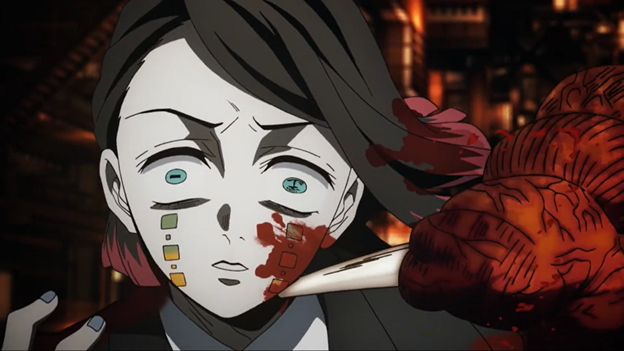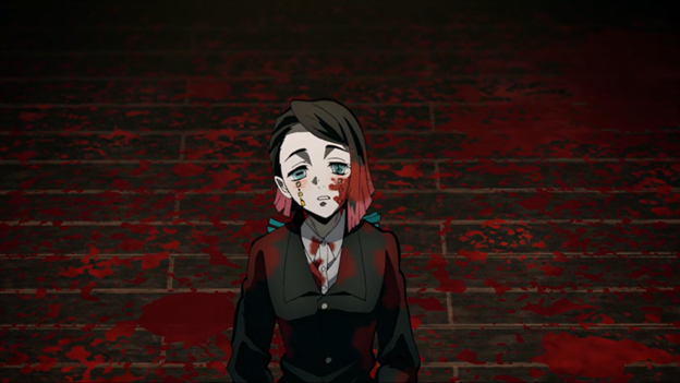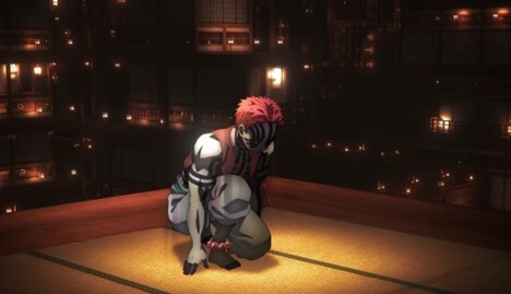 А ещё, в паре метров от неё самой и Мудзана, появился крайне мускулистый молодой мужчина среднего роста, со светлой кожей, украшенной узором из синих линий. С короткими, красно-розовыми волосами, жёлтыми глазами и характерной для всех демонов Двенадцати Лун татуировкой, с иероглифами «Высшее» и «Три». На прибывшем было совсем мало одежды, лишь короткое, обрезанное на талии, тёмно-розовое хаори без рукавов и передней части, да мешковатые белые штаны, закатанные почти до колена. Его звали Аказа и он был третьей Высшей Луной, мгновенно прибывшей по зову своего господина.