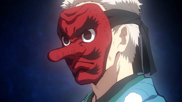 Прямо за нашими спинами стоял мужчина среднего роста, чуть выше Танджиро и немногим пониже меня самого. Его фигура была облачена в тёмную рубашку, такие же тёмные штаны и накинутое сверху голубое кимоно, с узором из морских волн. Лица видно не было, его полностью закрывала яркая красная маска, с едва заметными прорезями для глаз, вытянутым длинным носом, на манер Пиноккио и приклеенными пышными усами и бровями.