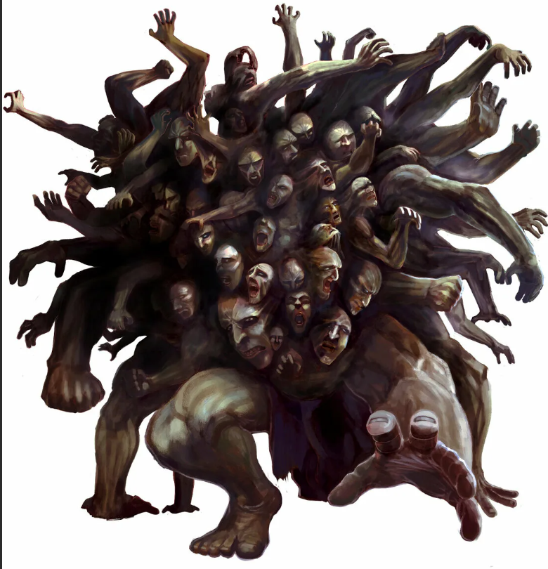 Внезапно среди стволов деревьев появилась рука, которая лёгким толчком повалила их на землю. Стоило им упасть как показался монстр, что имел довольно неприятный вид. Первое что бросалось в глаза это огромное количество голов и рук что прорастали выше живота. Каждое из голов имело разные эмоции, что на вечно застыла на их лицах. Ужас, радость, безумие, страх…