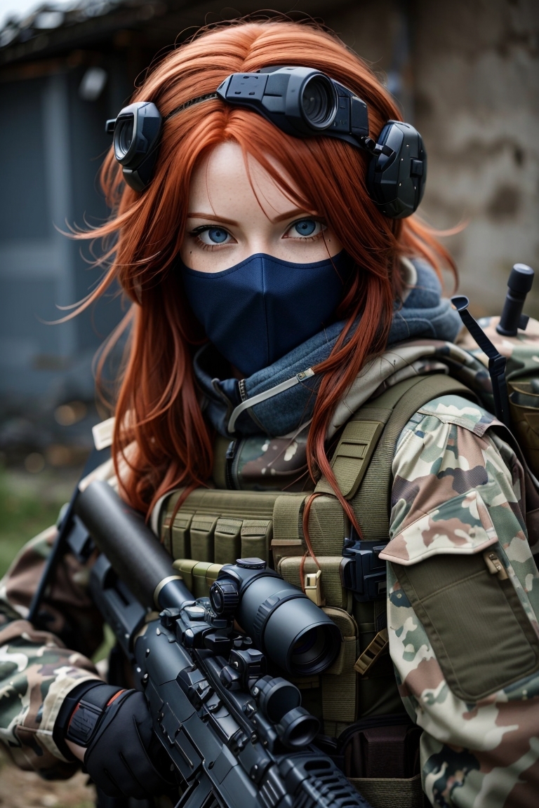 (Снайперша, родом из Ирландии. Раньше состояла в специальных вооружённых силах Великобритании. Поверх неё ещё маскировочный костюм по типу лешего, но его нейронка сгенерировать не смогла, как я не пытался)