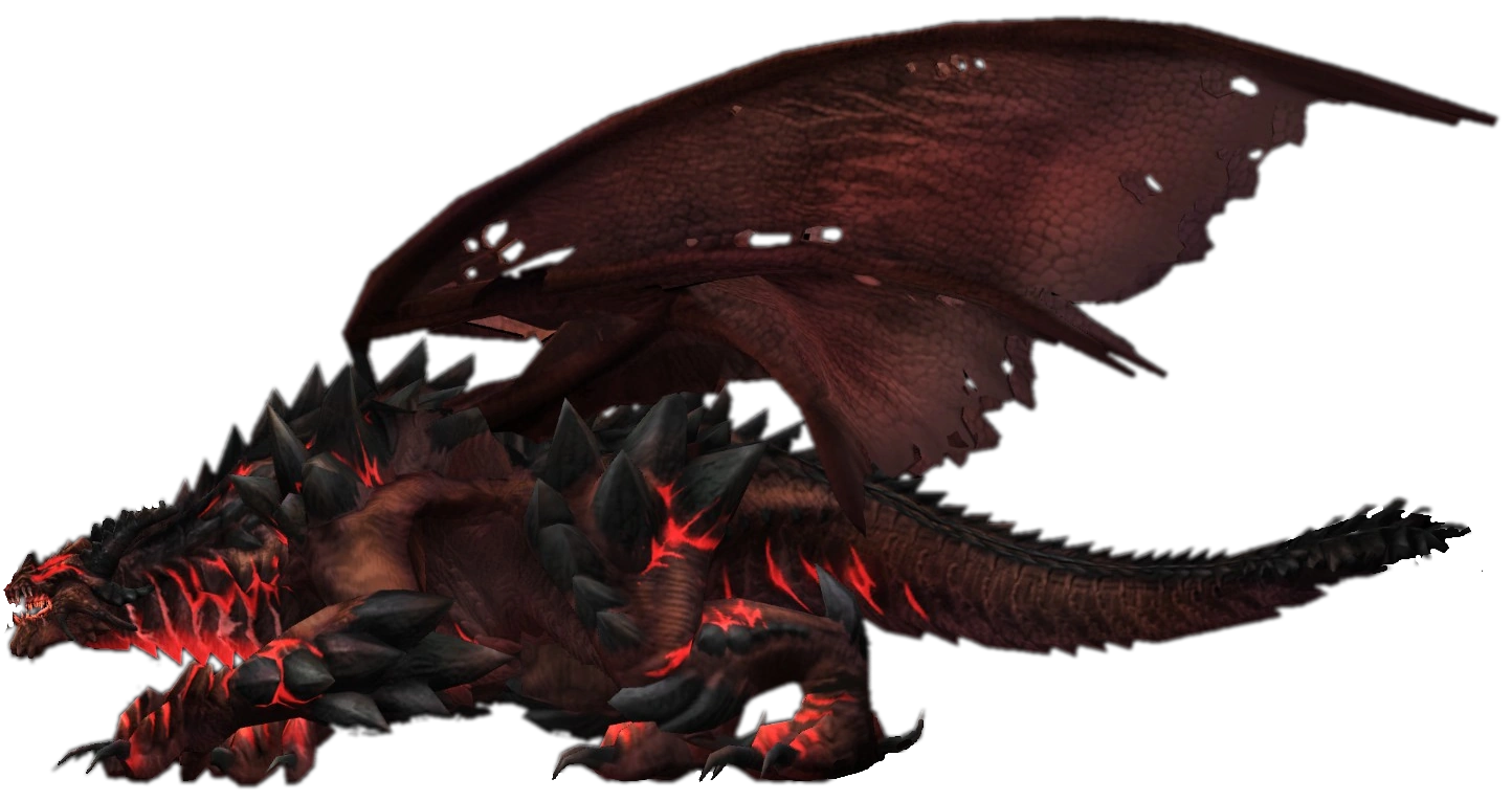 (Бегемот, младший брат Бахамута. В принципе облик его брата тоже не сильно отличается, разве что цвет черный и нет лавовых прожилок… к слову, размеры этого "красавца" как и у драконьей формы Лусиана, так что для мира тайманин Лусиан отнюдь не карликовый дракон).