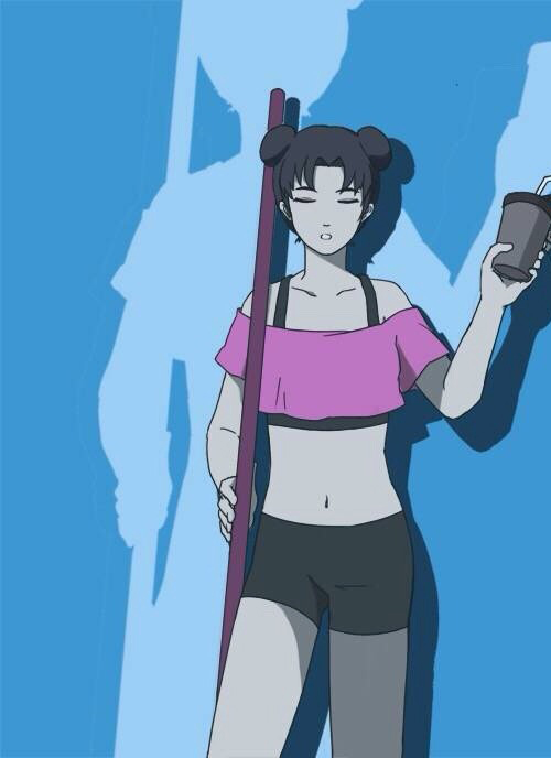 Спустя всего секунду, они услышали странное шуршание и шум, после чего последовали топот ног, и открытие двери. Когда дверь открылась, они увидели радостную Тен Тен, в спортивных обтягивающих черных шортах, и в розовом топе поверх черного спортивного.