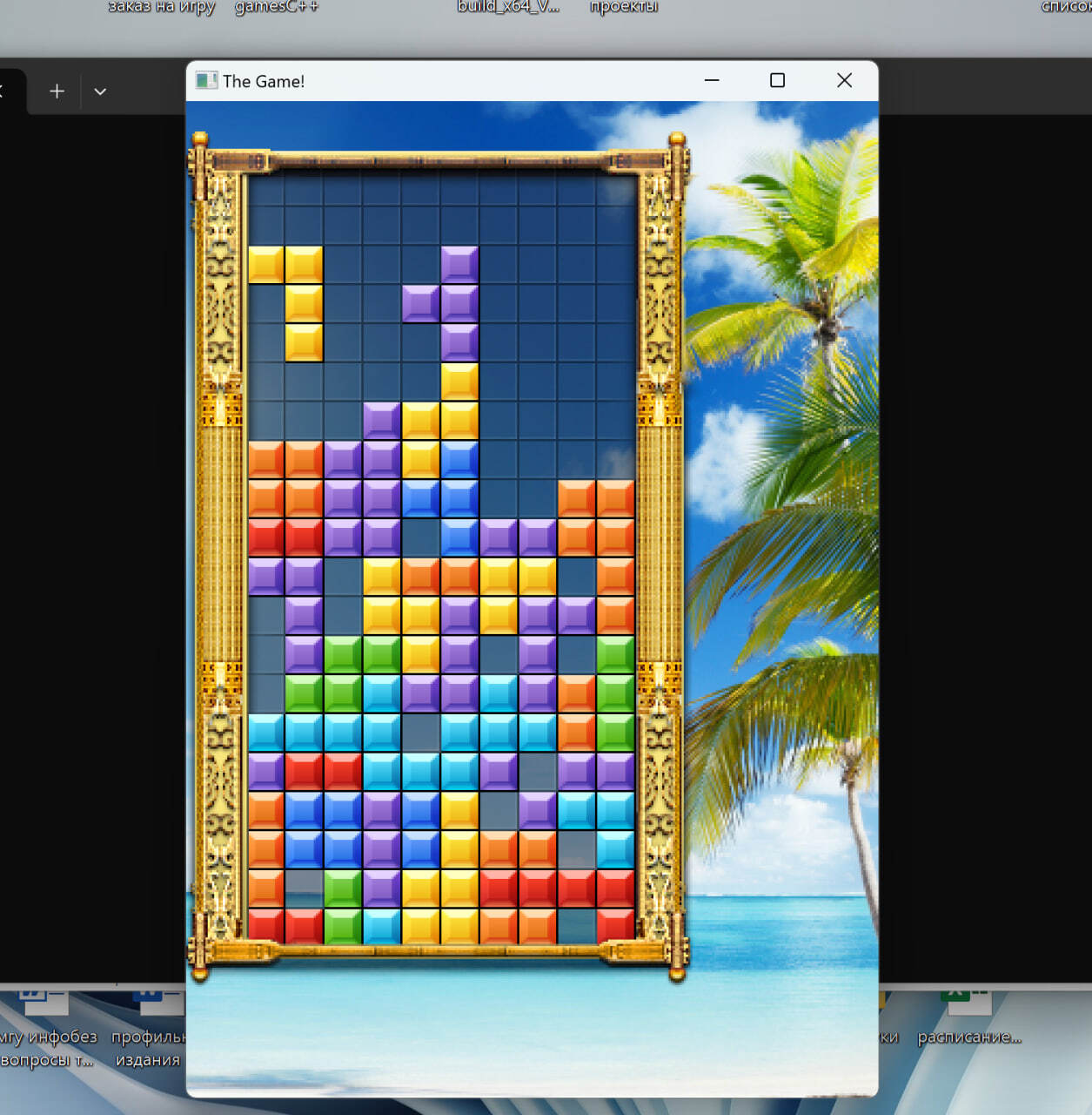 (Игру не дописывал, окончание — просто залипание появления фигур, перезапуск — закрыть/открыть окно, единственное, что поменял в исходниках — размеры окна и скрыл консольное окно)