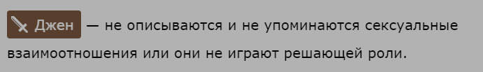 "Джен — не описываются и не упоминаются сексуальные взаимоотношения или они не играют решающей роли."