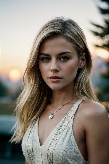 Выглядела она как красивая блондинка, хоть и крашенная, сами волосы спускались ниже плеч и были заведены за одно ушко. На ней было надето белое вечернее платье, а на шее висел такой же белый и сверкающий кулон. Сидела она возле голографического окна, показывающего закат, что лишь ещё сильнее выделяло данную особу.