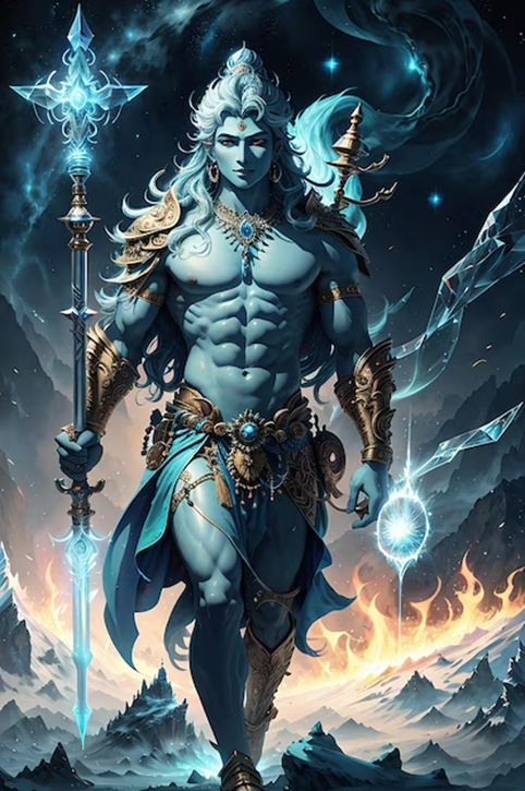 Не столь крупный, как пара его «братьев», не столь массивный, но куда более величественный. Двурукий полуголый мужчина с лазурно-голубой кожей и такого же оттенка вихрастой гривой, густым покровом укутавшей всю его широкую спину. Золотые наручи, одинокий наплечник, да узкие поножи — вот и вся броня, а в руках последний шив держал не копье и не посох, а оба их в одном орудии, концы которого источали из себя лазурное сияние.