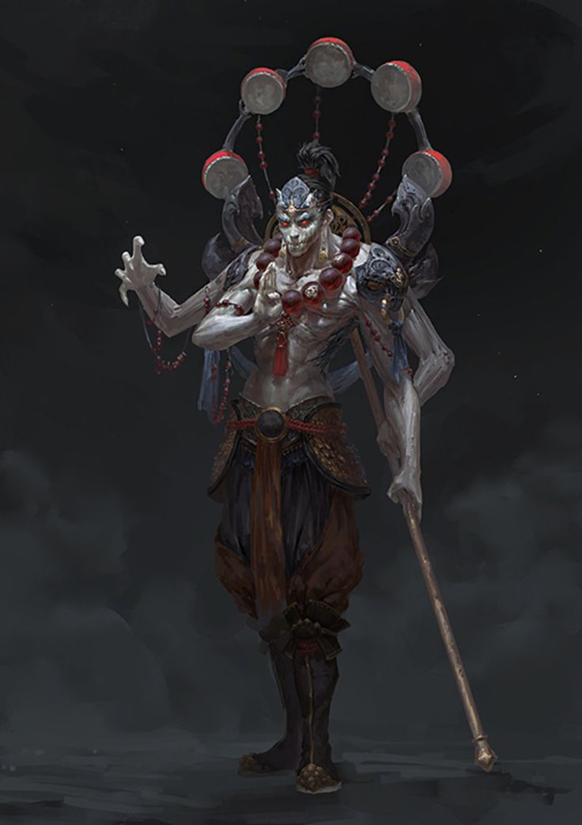 Огонь развеялся, являя миру очередного четырехрукого мужика. В этот раз его кожа была не синей, а оранжевой, отдавала краснотой. В руках у него всё еще были атрибуты, но их значения, увы, мне поведать не успели. Сам потом изучу — интересно же. Вроде бы то были четки, какой-то котелок, допотопный пульт от телевизора золотого цвета… или же расписанный слиток золота, что более вероятно, и… очередной цветок лотоса, но уже не розовый, а ярко-красный.