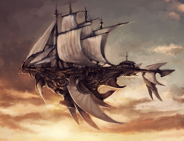 Идиллия была нарушена неожиданно. Очередной элемент сказки, что обратился страшнейшим кошмаром, ведь ни много ни мало, дитя увидела «всамделешный» летучий корабль. И не один. Целых три совершенно разных корабля, но замеченный девочкой первым выделялся на их фоне, как деревья Сабаоди выделялись на фоне декоративных ёлочек в парках Маринфорда. Огромный, каких она никогда раньше не видела, трехмачтовый резной гигант необычной формы. Гребни ниже ватерлинии в середине судна и в кормовой части, что напоминала, скорее, длинный тонкий хвост, чем нормальную корму, а также носовая фигура в форме раскрывшей пасть длинношеей рептилии придавали тому кораблю сходство с чем-то средним между драконом и рыбой. Возможно, именно так выглядели те самые морские короли, о которых рассказывал девочке отец. Монстры, заселяющие Северный и Южный Калмбелт.