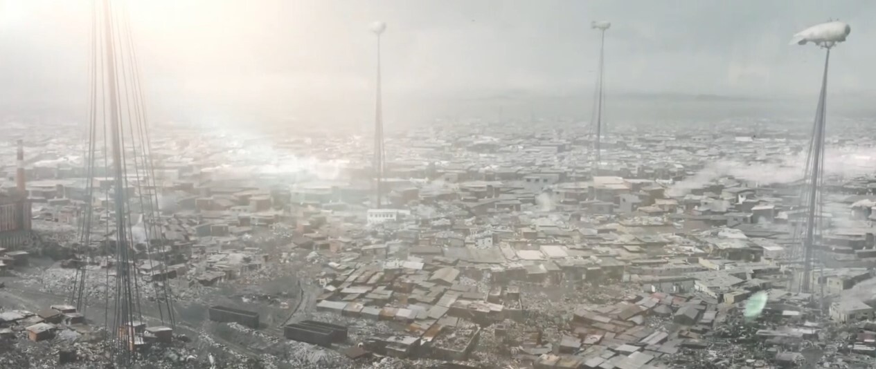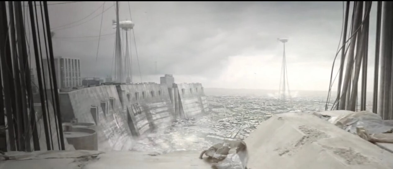 Как можно понять, климатическая обстановка в городе пасмурмная и часто кислотно-мрачная. За городом пекло и белая пустыня. Ни о каком сельском хозяйстве под открытом небом речи не идёт. Можно заметить, что это мегаполис, возможно, что там проживает 20 миллионов человек, может меньше, но не меньше 8-10 миллионов точно. Определённо будут гидропонные фермы или способы химического производства продуктов питания на такую ораву ртов. С энергией тоже обстоит всё не плохо и даже ездят машины на ДВС, то есть топливо тоже как-то производят. Ну, нефть есть, значит есть и бензин. На 21 миллион человек может хватит. Плюс трубопроводы или железнодорожные составы могут возить нефтепродукты откуда-то ещё.