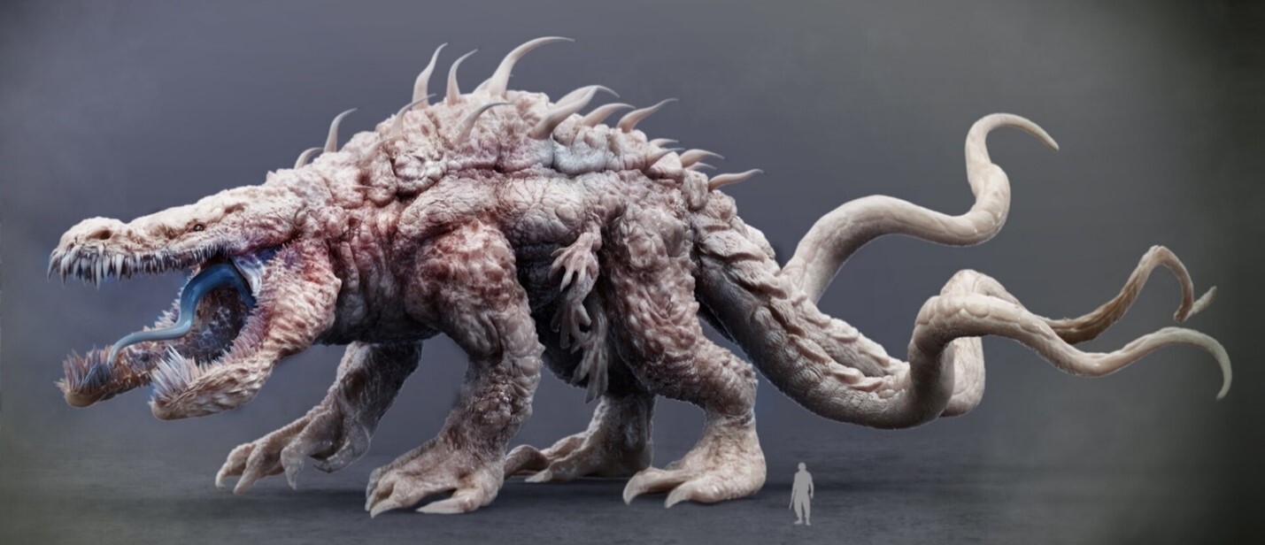 Казалось, с каждым шагом тварь менялась, становясь всё страшнее и опаснее. Вот, нижняя крокодилья челюсть раздвигается в стороны, демонстрируя чудесный частокол клыков, бездонную глотку и ожидающе подрагивающий язык, что готов схватить добычу и не отпускать. Из спины его в один миг вырвались острые белые шипы, из боков — плавники. Да и хвост был хвостом лишь секунду, а после обратился тройкой щупалец, танцующих за спиной чудовища.