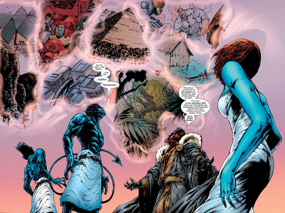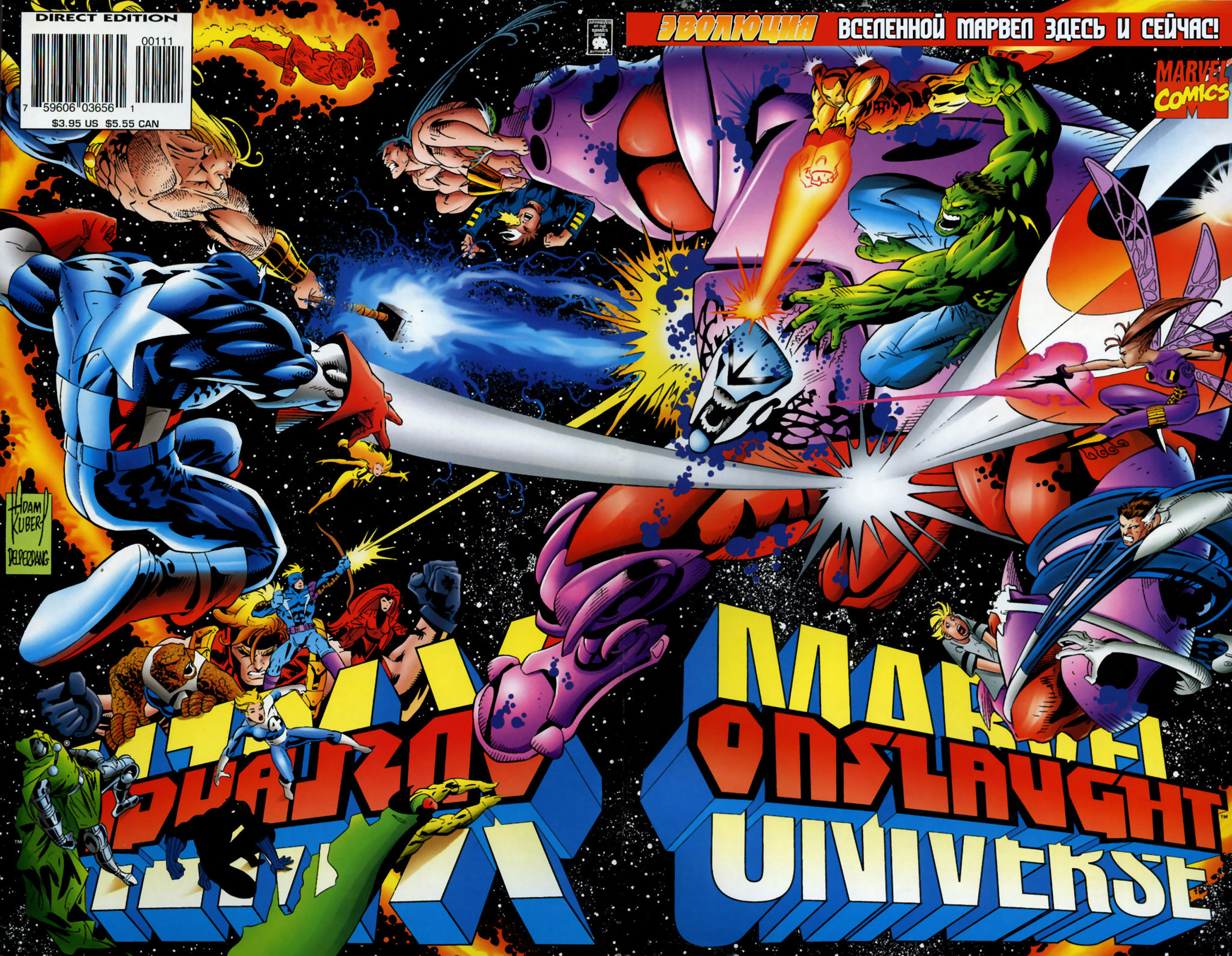 (Натиск и по бокам его противники — Доктор Дум, Железный Человек, Фантастическая Четверка, Мстители и Икс-Мены с Братством Мутантов)