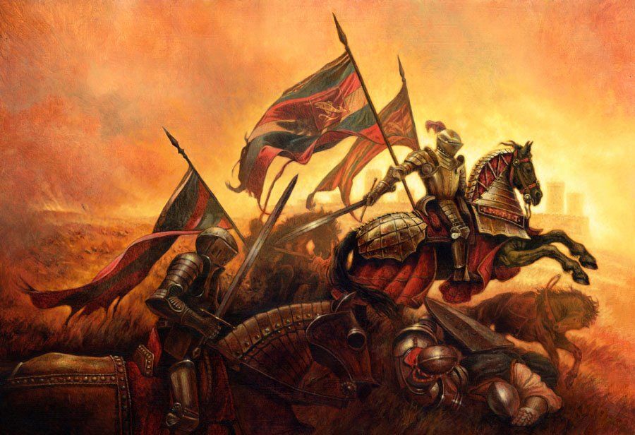 Он обернулся и увидел, как сзади сквозь ближайшие ряды союзников прорвались всадники, во главе со стальным гигантом с двуручным мечом. Не мешкая ни секунды гигант помчался на него. Руки рефлекторно достали меч. Ему удалось блокировать удар, который должен был рассечь его пополам. Только от безумной силы он упал с лошади.
