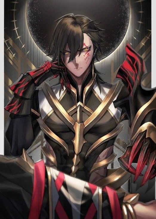 В одном из кресел сидел хозяин поместья — Маммон. Он был необычайной внешности мужчина. Черные волосы, золотые глаза, атлетическое тело и высокий рост, но самыми необычными были его татуировки, расположенные по всему телу, и выглядели, как черные клеймения. Единственное место, где их не было — это лицо, да и то на левой стороне было три красных символа, верхний из которых пересекал его глаз.