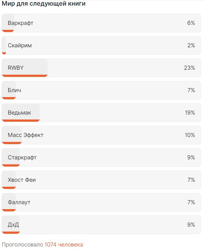 Я НЕ ХОЧУ писать по Варкрафту и Скайриму, но так как эти миры набрали так много голосов то они будут участвовать, но победа одного из этих вариантов скорее всего будет значить, что прода новой книги будет выходить раз в 2 недели, а может и реже. и если в скайриме дело в том, что я просто не хочу писать, то в Варкрафте еще и в том, что я вообще не знаю лора мира и его придется изучать.