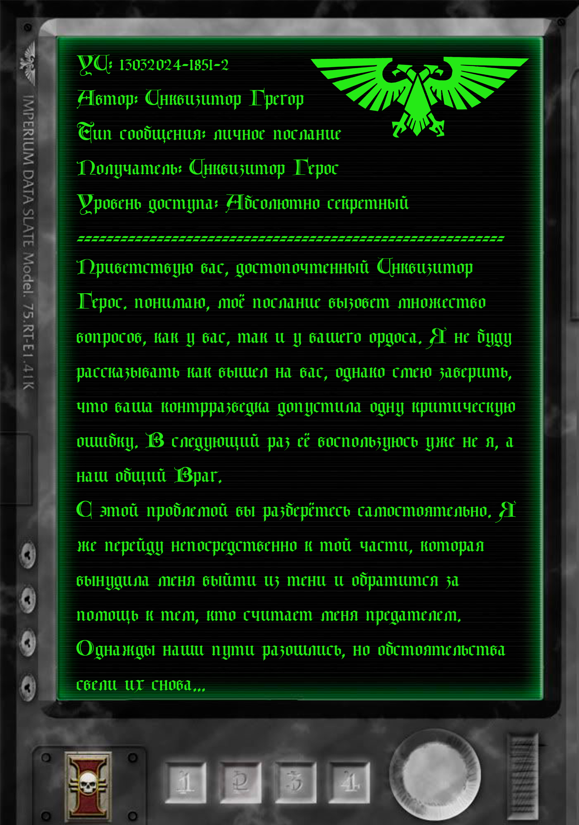 И вот вы уже снова собирались забыться в потоке истории, как покрывший плотным слои персональный когитатор издал звук. Вы сначала не поняли что это было, но когитатор пискнул снова. В последний раз сообщение на него приходило более века назад.