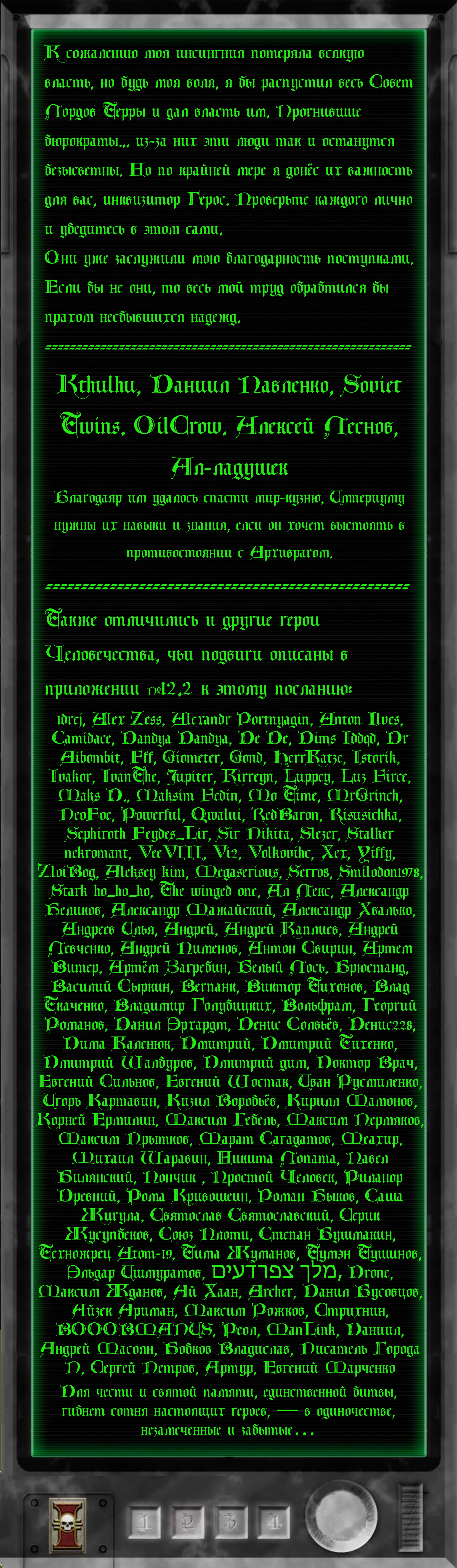 Так или иначе, прежде чем послание было самоуничтожено и от кода остались лишь нули, вы успели сделать копию списков, где были записаны имена тех, кто нашёл возможность во мраке далёкого и тёмного будущего сохранить частичку истины для потомков. Вы сделали несколько резервных копий, чтобы не потерять ни одно имя и тут же вывели их на дополнительный экран, что был больше и мог уместить их всех сразу.