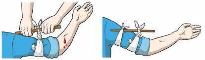 Так вот. Если кто-то предложит наложить жгут на артериальное кровотечение — наложите ему. На шею. Ответственно заявляю: без специфической практики никто не наложит жгут так, как надо. Пока будете пытаться, кровь будет утекать бодрой струей. Усилие для стандартного жгута Эсмарха (резиночка такая в аптечках автомобильных) даже на плечо нужно нетривиальное. А уж на бедро — вообще. Жгут типа "палочка и закручивать" — работает. Но: очень важно сделать подкладку!!!! Мягкую, толстую подкладку, чтобы жгут не пережимал нервы на небольшой площади. Гибель нерва делает конечность бесполезной. Ну и фиксация: закрутили — и длинный конец палочки нужно прификсировать. Примерно так: