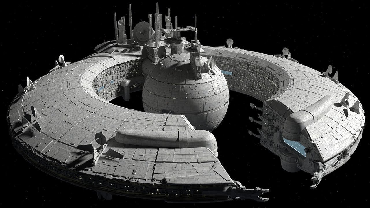 Чёрная ткань космического пространства была разорвана, а из возникшей бреши показался футуристического вида космический корабли в форме неполного круга. В самом центре белой громадины висела сфера, внутри которой доносился звук тревоги.