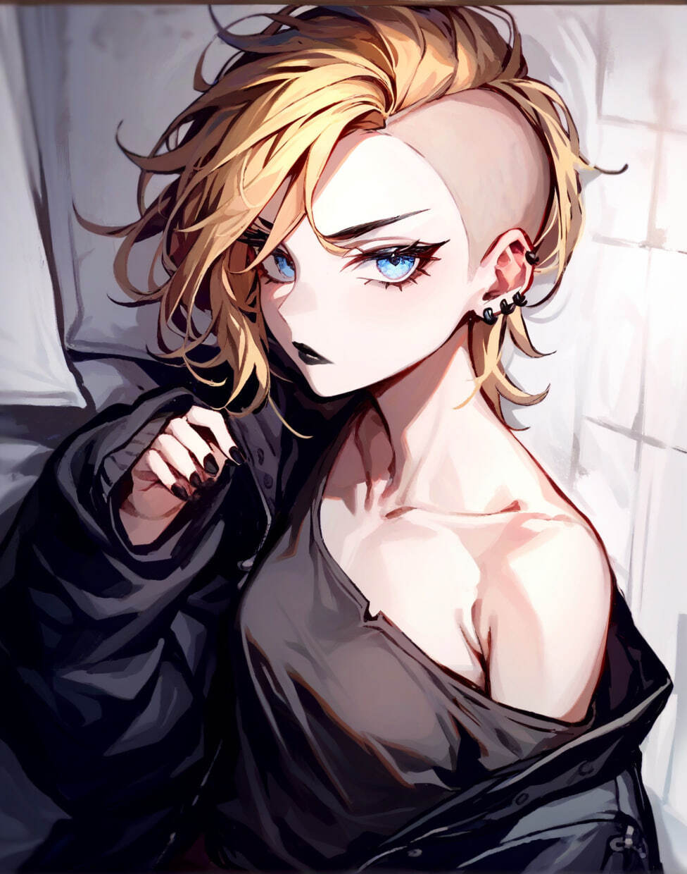 Светлые блондинистые волосы, выбритый висок, чёрная тушь под глазам, успевшая слегка растечься, и тёмные губы, из уголка которых текла кровь.