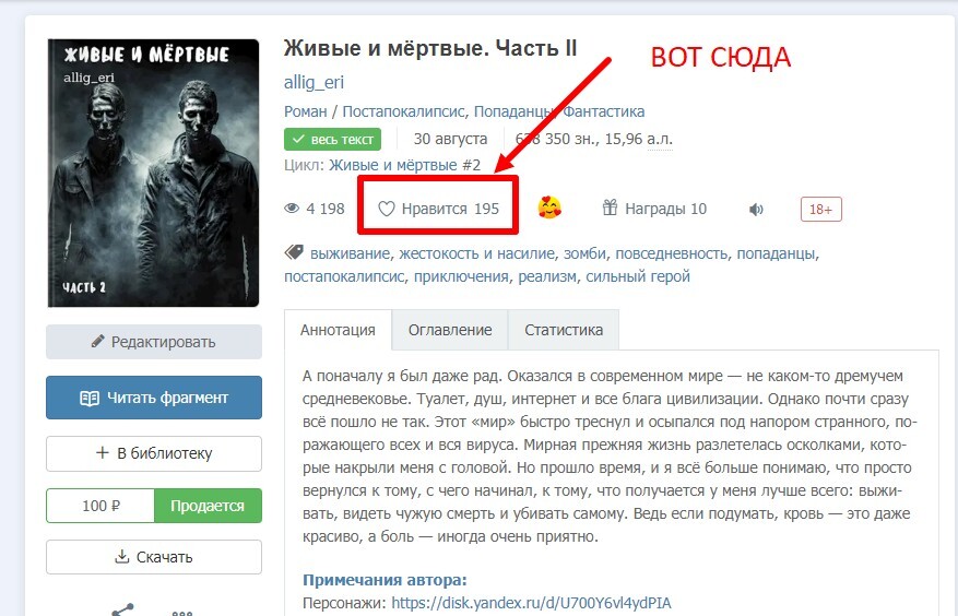 Сейчас там 195 лайков, нужно собрать сверху ещё 500 штук. Т.е. чтобы было 695 лайков. Потому что я знаю вас :) Кому-то оказался не интересен жанр, кто-то даже не знает об этой работе, кто-то читает на Бусти, а кто-то принципиально не ставит лайки.
