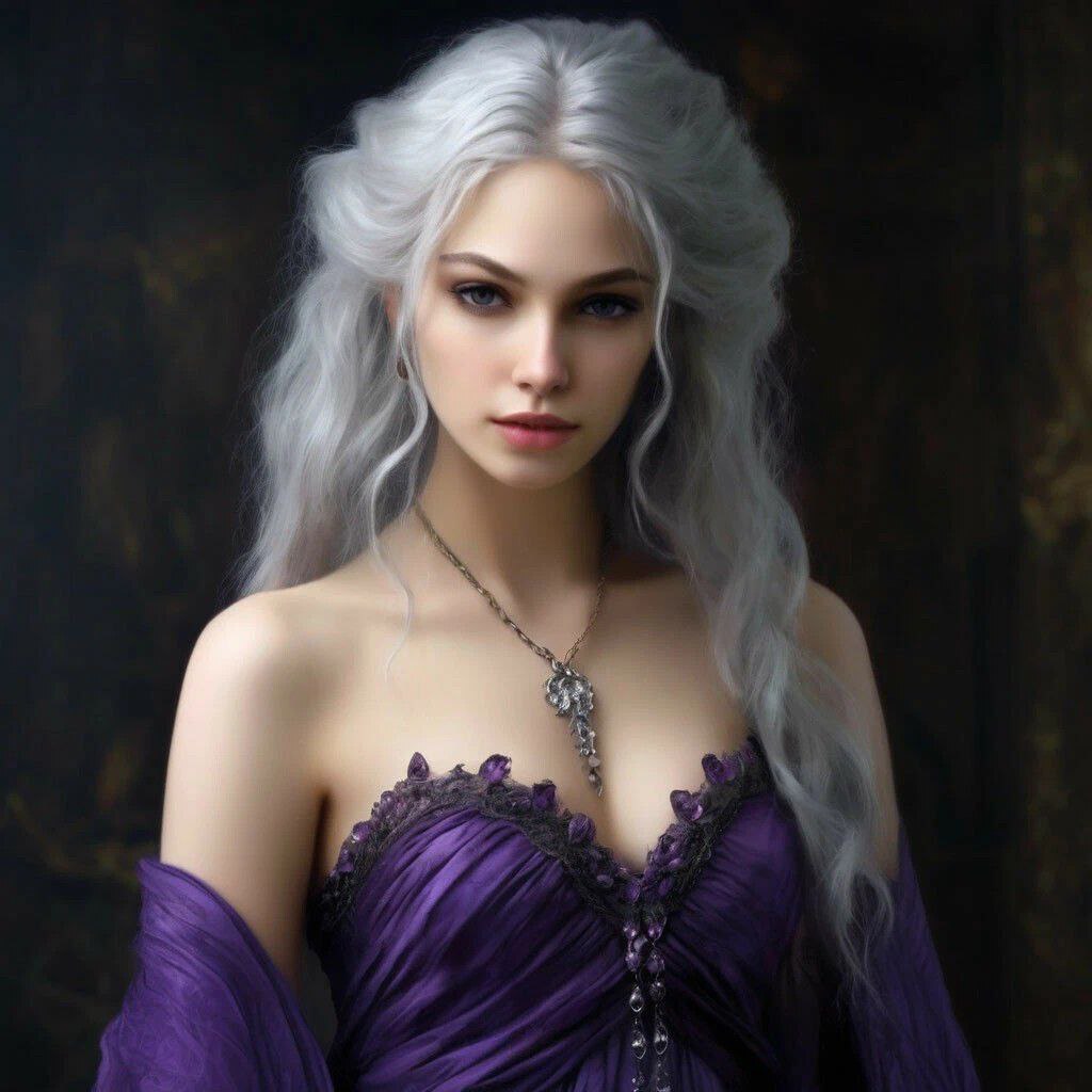 С другой стороны, Жаждущей было не отказать во вкусе и самодостаточности. Никакого глупого подражания одной из ипостасей Варды, звёздной или облечённой в плоть, чем была грешна Мать Нетопырей, выбравшая себе обличье бледнокожей черноволосой девы. Нет, образ гостьи сиял собственной, уникальной красой. Волосы цвета жидкого серебра водопадом ниспадали на обнажённые плечи, резко контрастируя со струящимся платьем тёмно-фиолетового цвета — в тон сиявшим пурпуром глазам. Бархатная кожа золотистого цвета подчёркивала тёплые, мягкие черты лица и улыбку, скрывавшую на самом деле голодный оскал. Тонкие пальцы худощавой миниатюрной фигуры сцеплены за спиной, словно пряча от требовательного взгляда заготовленный кинжал. На шее — серебряное ожерелье с аметистами. Такое, что, с одной стороны, казалось изысканной насмешкой, драгоценным ошейником. А с другой — было носимо без малейшей капли уничижения.