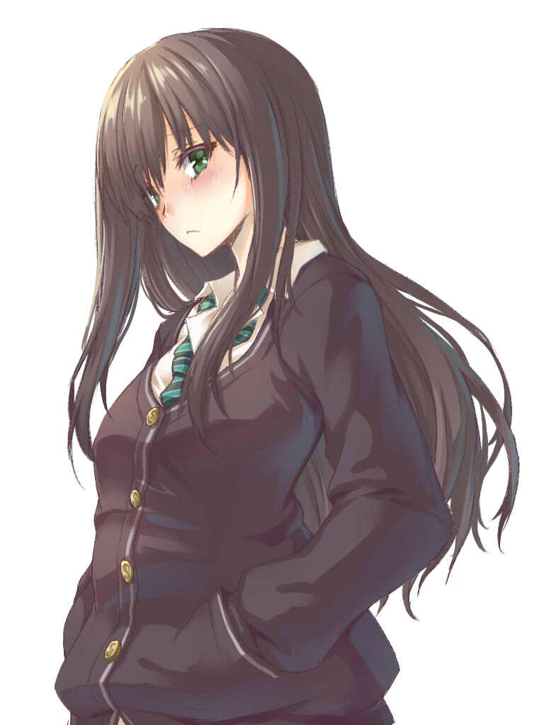 Но долго думать не пришлось. В класс зашла девушка азиатской внешности с светлой кожей, зелёными глазами и длинными свободно спадающими тёмно-каштановыми, почти чёрными, волосами. На ней была японская форма: белая блузка, чёрный джемпер на золотых пуговицах зелёный полосатый галстук и чёрная плиссированная юбка.