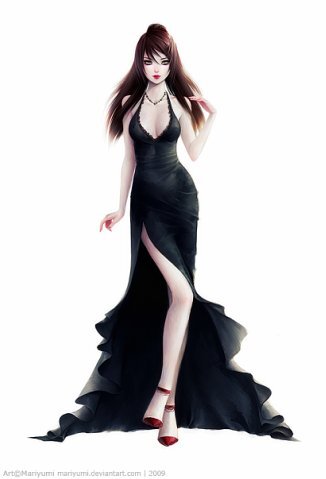 Сейчас на ней красовалось черное платье с длинным подолом до пола и боковым разрезом справа. Лямки удерживались с задней части шеи, оставляя открытыми декольте, плечи, руки. Из обуви на ней были красные туфли на каблуке. В качестве прически она сделало что-то на подобии хвоста с свободно спускающимися волосами. Немного макияжа на лице обрамляли её естественную красоту.