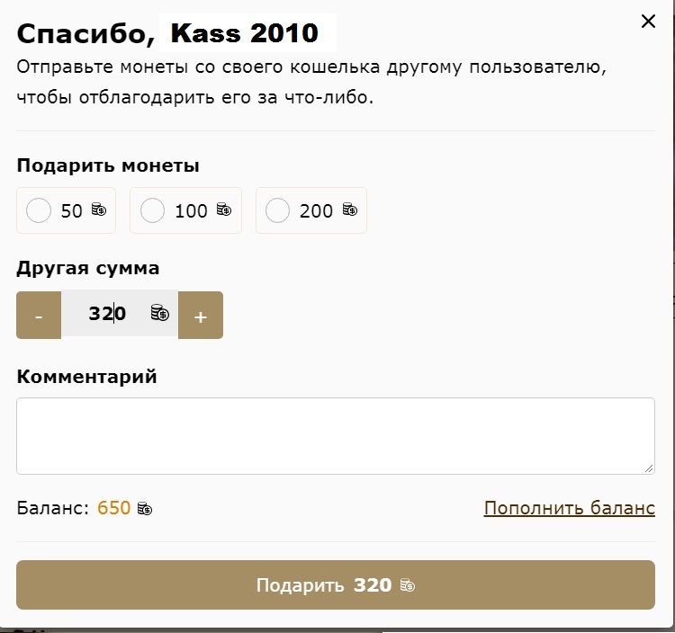 Вписываете в "Другая сумма" 320 монет и жмете "Подарить"
