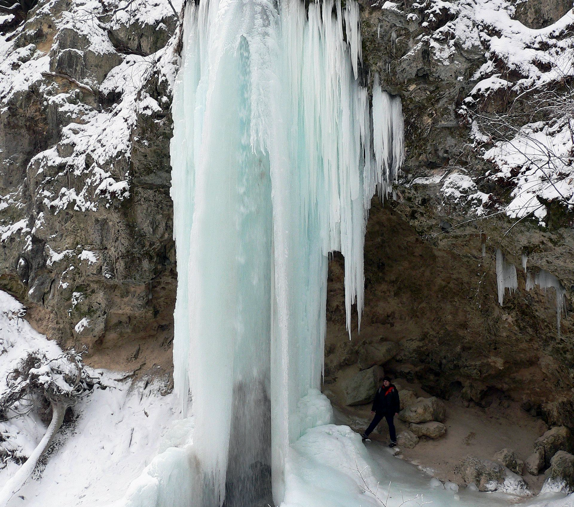 Мороз сковал скатывающиеся со скалы струи, и они замерзли, образовав гигантские сосульки — сталактиты. Застывшие потоки свисали с отвесной стены высотой не менее двадцати футов, но если внимательно присмотреться, то можно было увидеть текущую в толще льда воду.