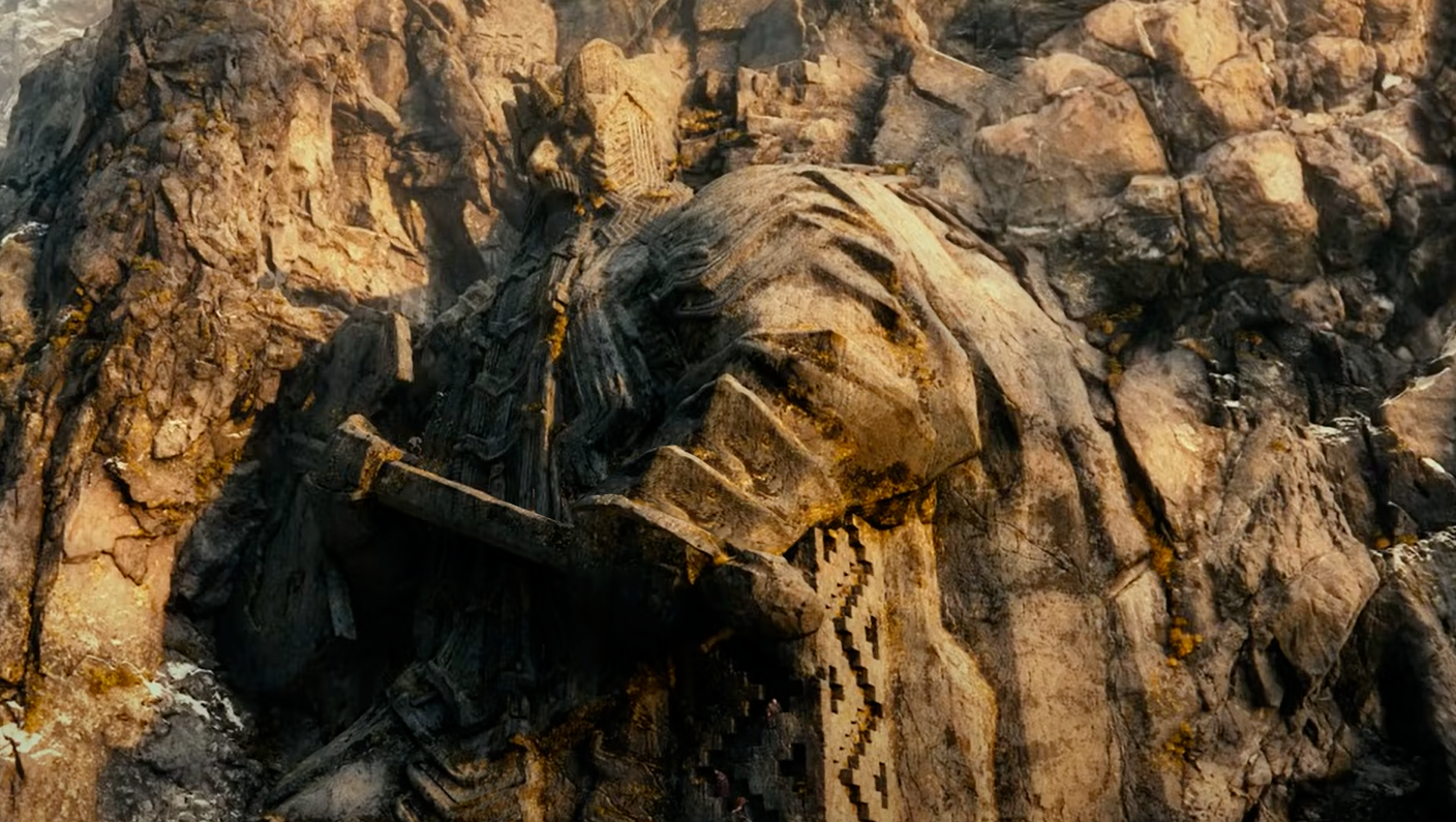 — Вы не видите? Странно? А возможно я просто проехал дальше и у вас лругой угол обзора. Когда все оехали до точки, где ждал их разведчик он еще раз указа на склон и там действительно кое-что было: вытесанная прямо в склоне изображение кого-то из подгорных королей.