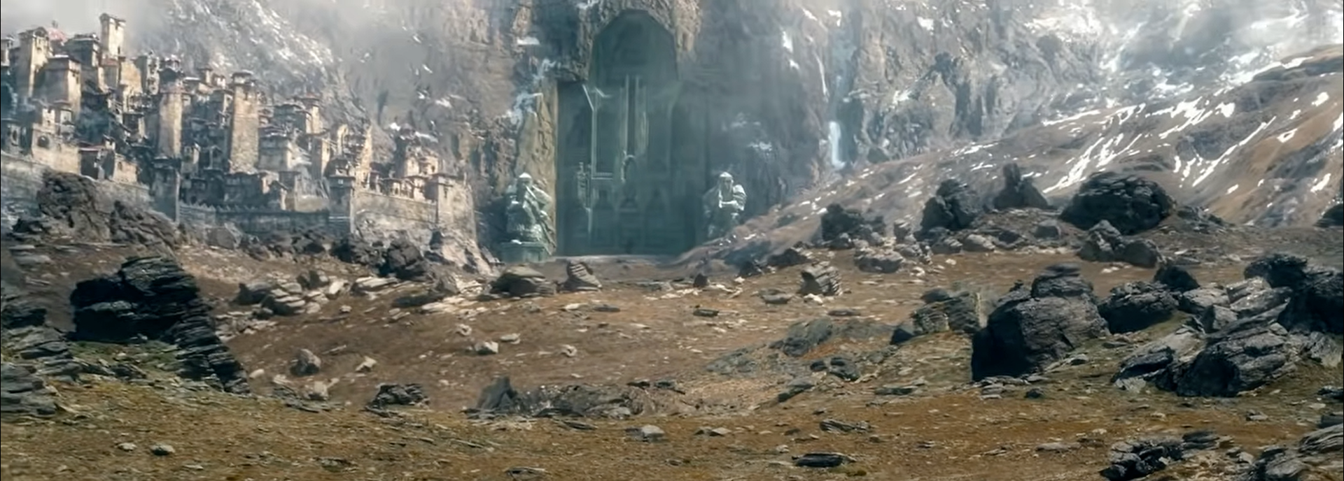 Дорога начала выглядеть странно. Если раньше по бокам от тропы мелькал лес в разных его проявлениях, то теперь это было похоже на какие-то смазанные образы непонятно чего: как-будто они ехали по туннелю среди густого-густого тумана, через который было не разглядеть, через что он проложен. И закончилась тропа тоже необычно — вот еще только они ехали в светлом тумане и вдруг прямо перед путниками возникли склон горы с главными воротами Эребора и заброшенный город Дейл, а туман исчез, как его и не было.