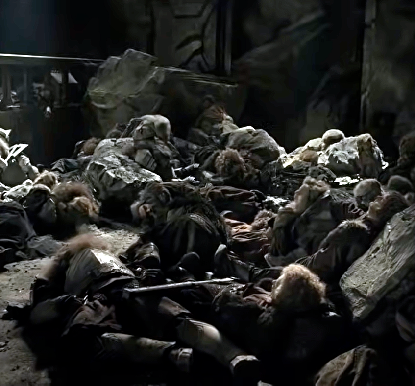 После одного из поворотов отряд наткнулся на помещение в котором находилось много останков мертвых гномов. Причем это были в основном женщины и дети, судя по полуистлевшей одежде и размерам тел.