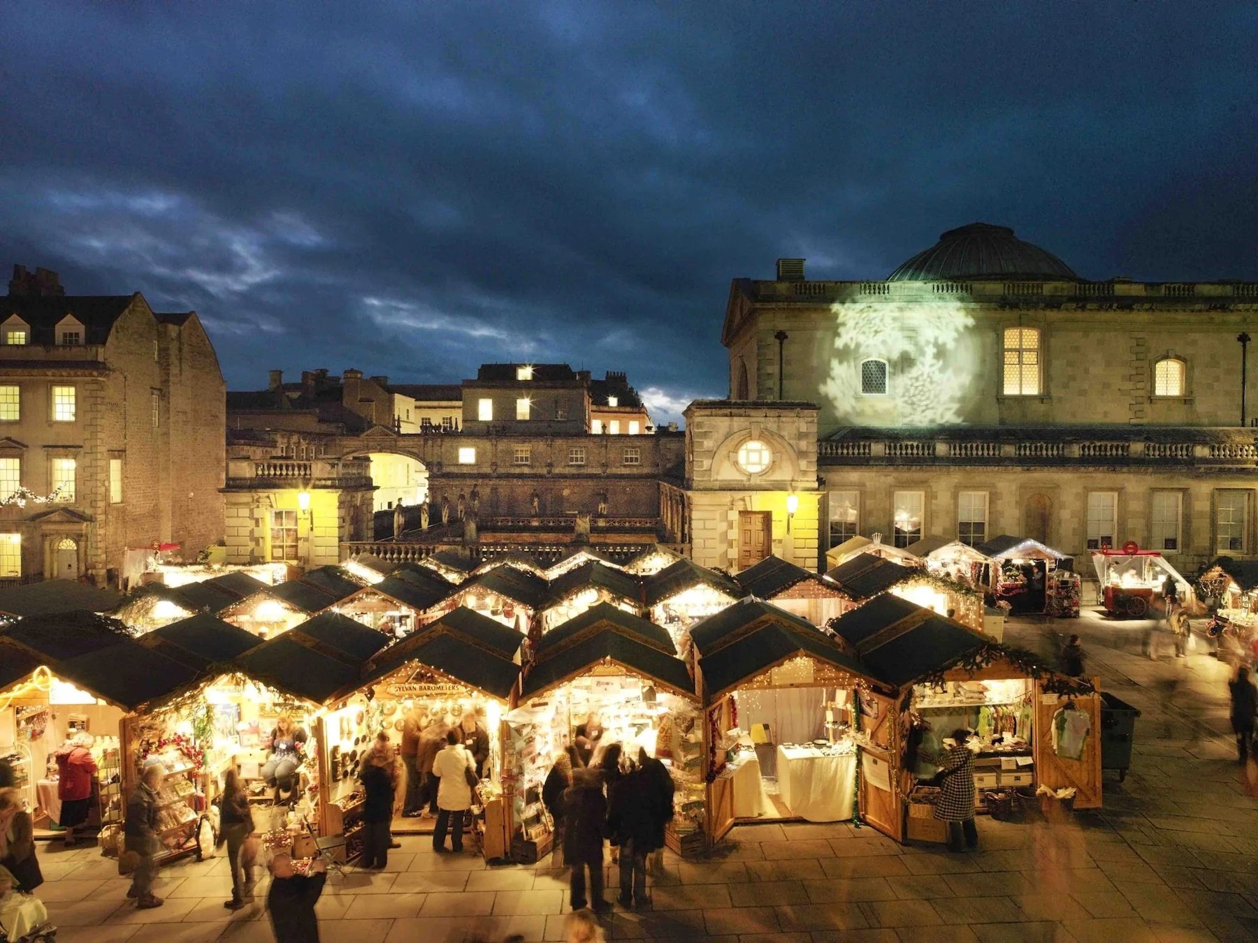 И мы отправились в магловскую часть Бата на рождественскую ярмарку. Город в преддверье праздника изменился до неузнаваемости: между Батским аббатством и музеем Римских бань была выстроена пара сотен деревянных домиков, празднично украшенных и подсвеченных, в которых продавались елочные украшения, сладости и всевозможные подарки.