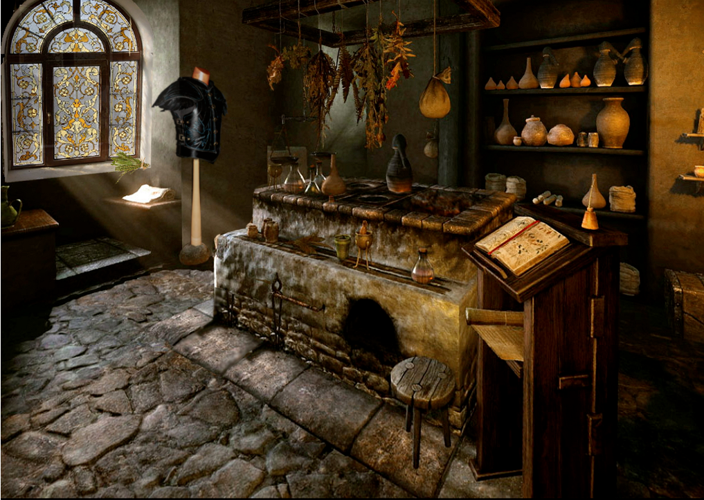 В дальнем углу, у окна с мозаикой, располагался каменный прилавок, над ним и на стене были развешены всякие травы, стояло множество глиняных горшочков разных размеров, а также кувшинов и бутылей. На прилавке лежали несколько досок для нарезки и ножи. В шкафу стоял рядок котелков. На пюпитре располагался открытый фолиант. Это была зельеварня.