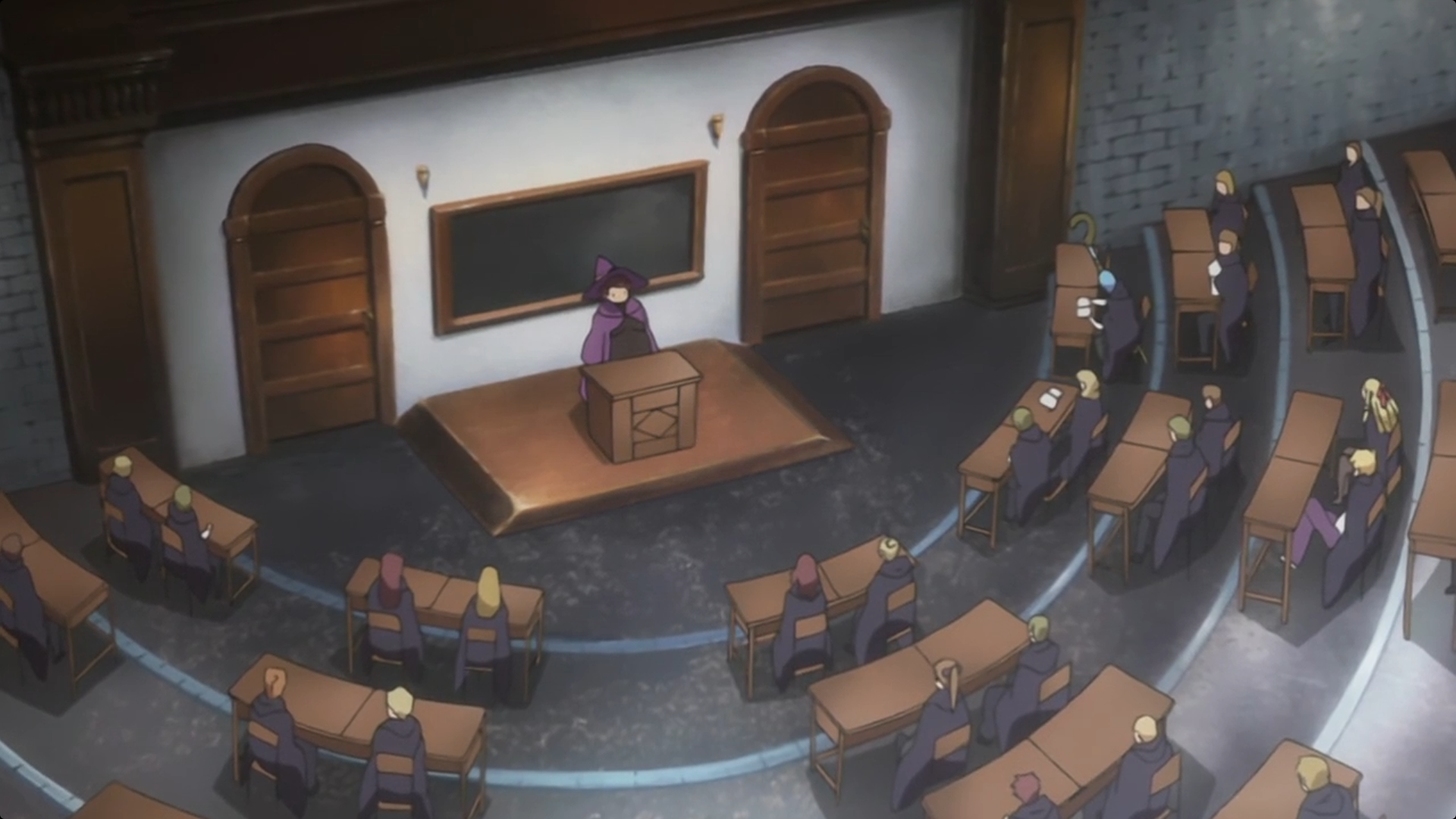 Классные комнаты в Академии Волшебства были похожи на самые обычные лекционные аудитории в университетах. Преподаватель, ведущий конкретную лекцию, он же волшебник-учитель, стоял у доски, или за специальной трибуной, на самом нижнем уровне аудитории, а места, где сидели студенты, размещались снизу-вверх подобно лестнице.