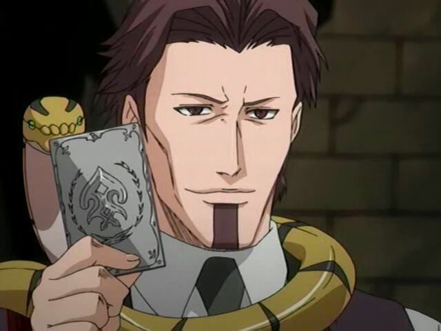 Подтянутый мужчина с узкой бородкой под губой в центре внимания. Он ухмыляется, двигая руками, словно дирижер оркестра. В одной руке зажата металлическая карта, символ его силы.