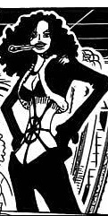 Она пришла в довольно вызывающем наряде, в котором она действовала не как владелица кафе, а как агент. То есть сейчас волосы у неё были распущены и шевелюра у неё была мое почтение, наверное это так специально для лучшего использования фрукта. Волосы были кучерявыми и тёмно-синего цвета, весь её наряд был тёмно-коричневого цвета, начиная от жакета с длинными рукавами и меховой окантовкой, обтягивающими брюками с низкой талией, туфлями, заканчивая бикини-топом такого же тёмно-коричневого цвета, с тем самым узором напоминающим паутину паука. Она тоже дымила, только из трубки.