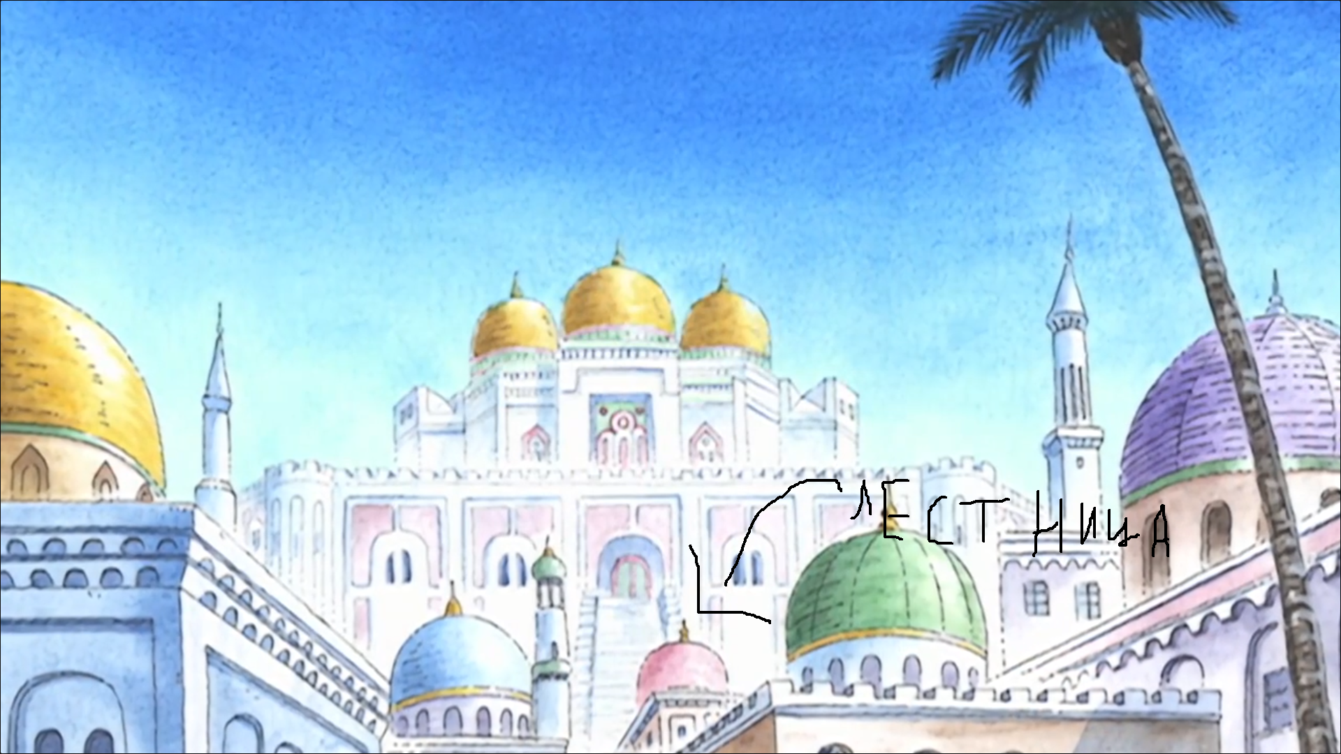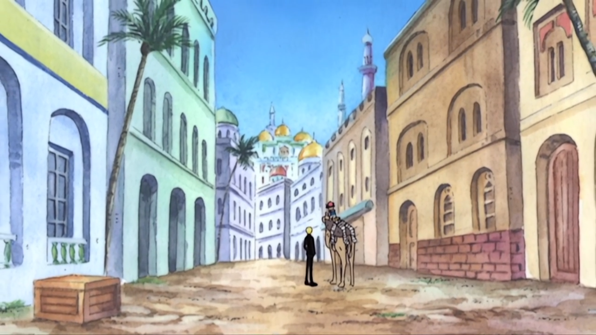 Сама Усыпальница находилась за городом. Сейчас нам надо на центральную городскую площадь. Там рядом и Дворец. Дворец кстати огромен и куча зданий раскиданы перед ним. Мне очень нравится эта страна. Всегда нравилась подобная архитектура. Ближе всего к арабской теме нашего мира. Арка Алабасты вообще одна из моих любимых. Всегда ловил ностальгию от той старой рисовки, когда пересматривал некоторые моменты с Крокодайлом и Луффи. Здания здесь, такие трех-четырёхэтажки и на крышах купола. Куча арок вместо проходов и окон. Постройки часто либо белые или светло-голубые, либо светло-коричневые.