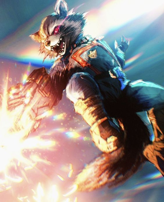 Ракета стоял на обломках перевёрнутого транспорта, держа в лапах массивный бластер, который был явно больше его самого. Его глаза сверкали от безумного восторга, а хвост нервно подергивался.