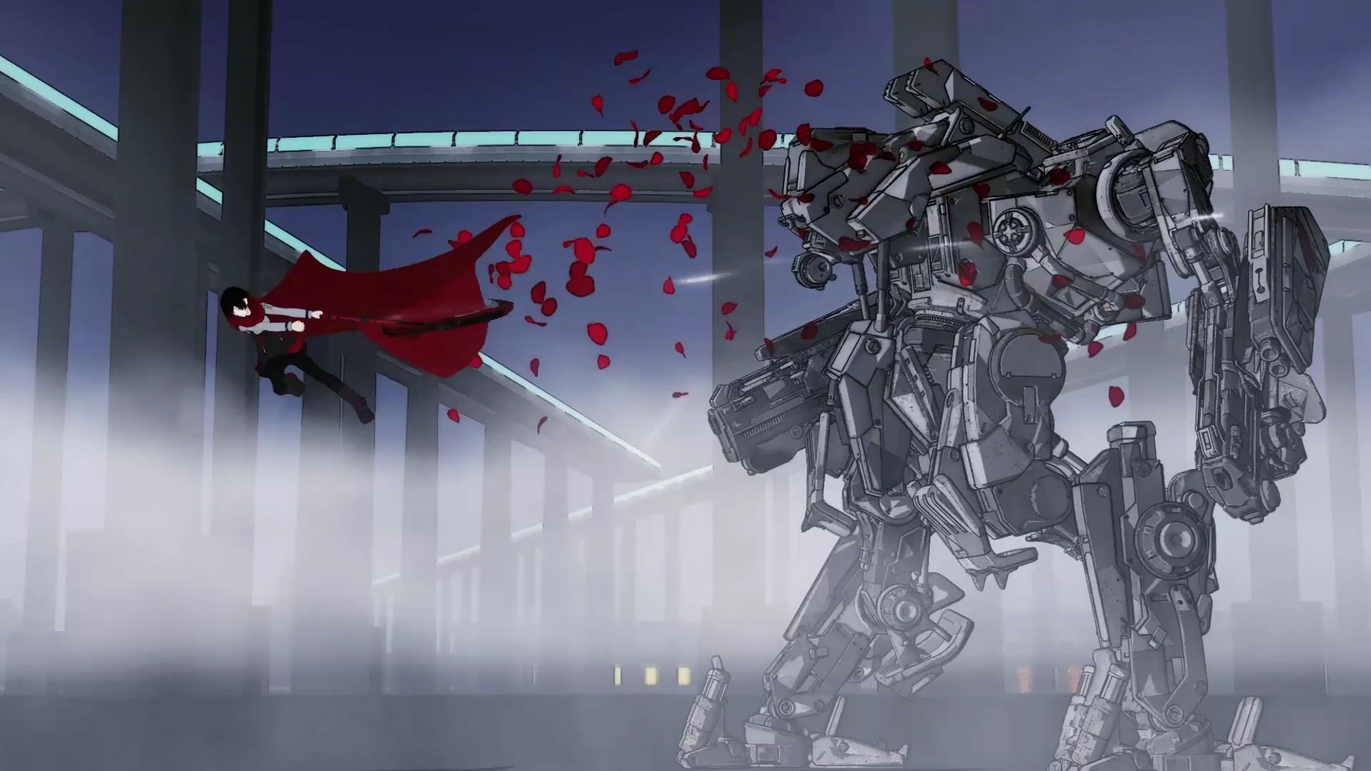 Нора спрыгнула с вершины башни из столов, при этом в руках у неё была ножка одного из них. Приземляясь она воткнула ножку в арбуз, таким образом получив своеобразный молот. Противником Норы стала Руби, которая очень ловко уклонялась от её атак, то и дело нанося удары руками.