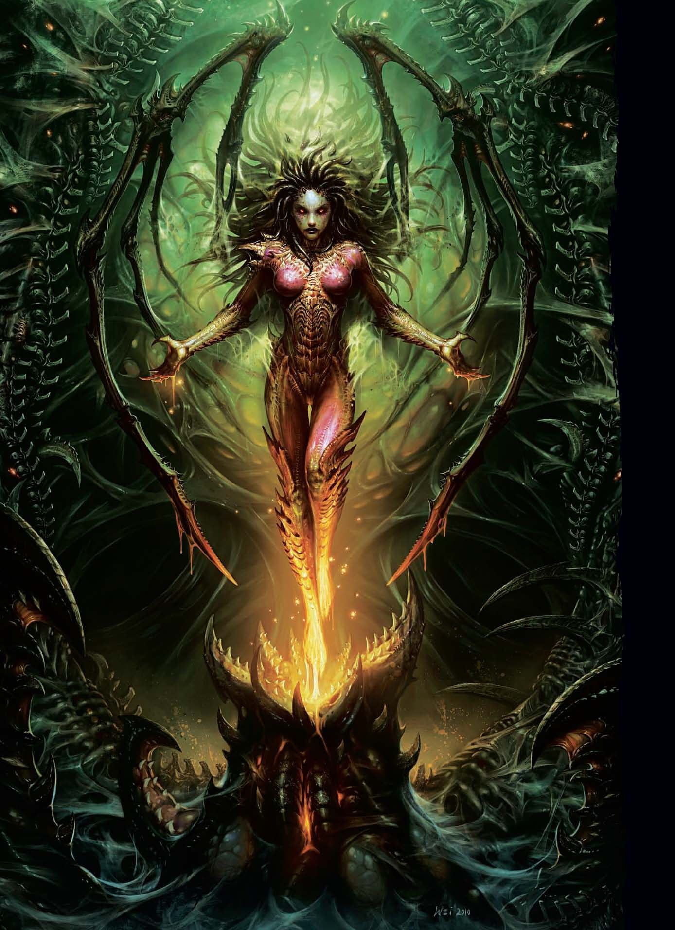 Новое тело Сары, сохраняло гуманоидный облик, но во всём остальном полностью соответствовало «стилю» зергов. Полностью зеленое лицо, лишенное человеческих изъянов, светящиеся расплавленным золотом глаза, точенные брови, прямой аккуратно-ровный нос, идеальные по своей форме губы. Пышные волосы, больше похожие на сухие ветки, несмотря на твердый и казалось бы жесткий вид, были довольно гибкими и подвижными. Торс и ноги покрывала фиолетовая кожа, частично покрытая укрепленной хитиновой броней. От паха до груди, все было покрыто укрепленной броней, проходя между двух грудей и переходя на плечи и шею, выступая заостренными шипами. Ноги с внешней стороны бедра, также были защищенны хитином с выступающими заостренными шипами, с колена и ниже переходя в полноценную броню, также как и руки начиная от локтя. За спиной же раскинулись костлявые крылья, к которым по какой-то причине забыли приделать кожаные мембраны, оставив лишь подвижные, костяные, похожие на паучьи лапы, «конечности».