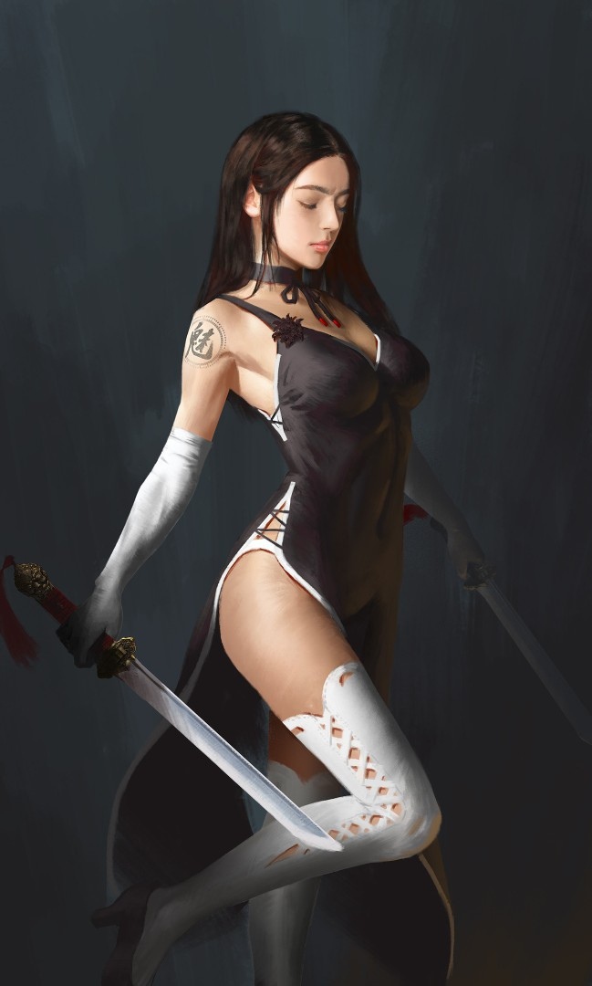 Девушка несмотря на прожитые годы, оставалось все той же фиолетоволосой милашкой, с чувственными, пухлыми губками, вздернутым носиком и яркими зелеными глазами. Единственное что изменилось, так это подросшая грудь и округлившаяся попа, а также ямочки, которые теперь ей придают чуть более зрелую красоту, чем миловидность. Одета же девушка была в наряд, совсем не соответствующий скрытной работе. Я не знаю как правильно назвать ЭТО, но выглядело это как два куска ткани, которые слегка сшили по бокам, а также налепили сверху лямки, которые позволяли этому не падать на землю. Руки слегка выше локтя закрывали белые перчатки, а ноги могли похвастаться довольно притягательными белыми чулками. На шее был небольшой ошейник из ткани с завязанной бабочкой из шнурка, а на правом плече виднелась татуировка, которая по совместительству являлась кидо.