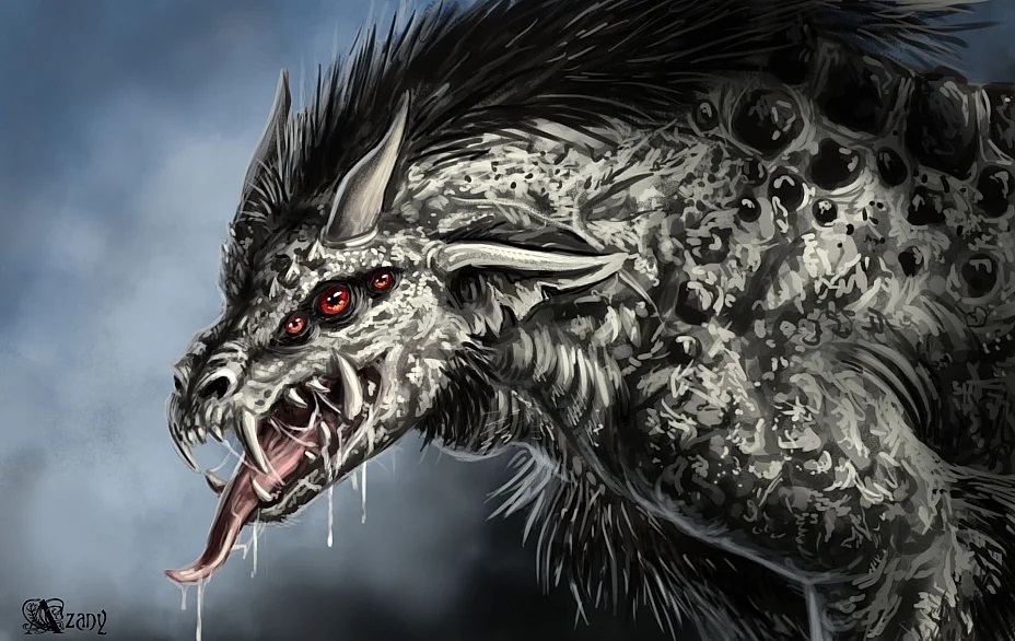 Но вот визуальный столб реацу пропал и все зрители могли узреть облик превратившегося. Невысокий, сгорбленный, худощавый бледно-серый монстр с черной редкой шерстью. Все тело было покрыто наростами, а также какой-то слизью, которая не переставала бурлить, то тут то там взбухая пузырями и лопаясь. Уродливое шестиглазое лицо с вытянутой челюстью, больше походило какой-то смеси ящерицы и летучей мыши, чем волку или гончей. Острые уши, два маленьких рога, широкие ноздри и клыкастая пасть с кривыми и редкими зубами, больше похожими на шипы, завершал же картину длинный язык с которого непрерывно лилась та же самая слизь.