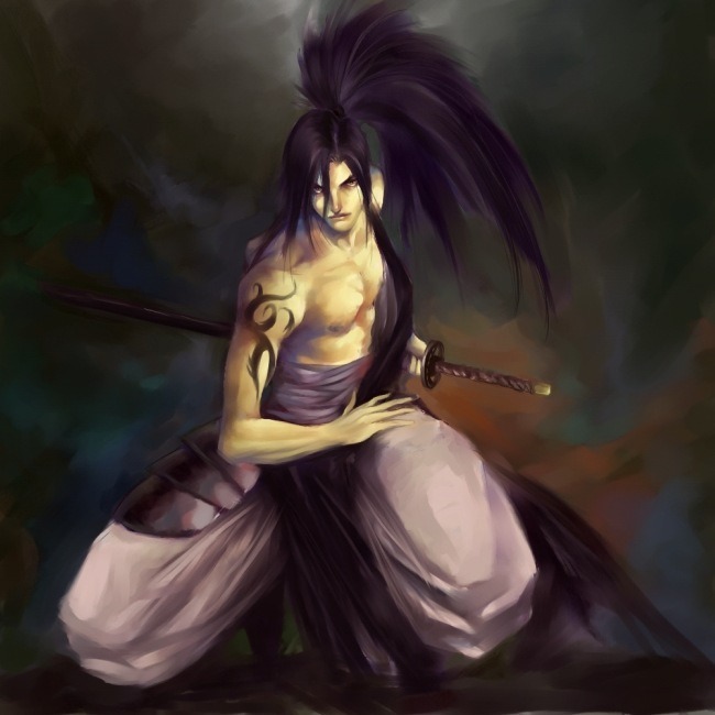Неожиданный гость выглядел, максимально чуждо находясь среди белоснежных пустых. Довольно низкий на фоне горбатого пустого синигами, был одет в белые хакама, которые имели щиток на правом бедре, служащим для защиты. Вверх был почти полностью обнажен, если не считать повязанных вокруг живота бинтов, а также изодранного косодэ, который держался лишь на левом плече. Черные, длинные волосы были завязаны в пушистых хвост, которые задевали его катану, покоящуюся на поясе.