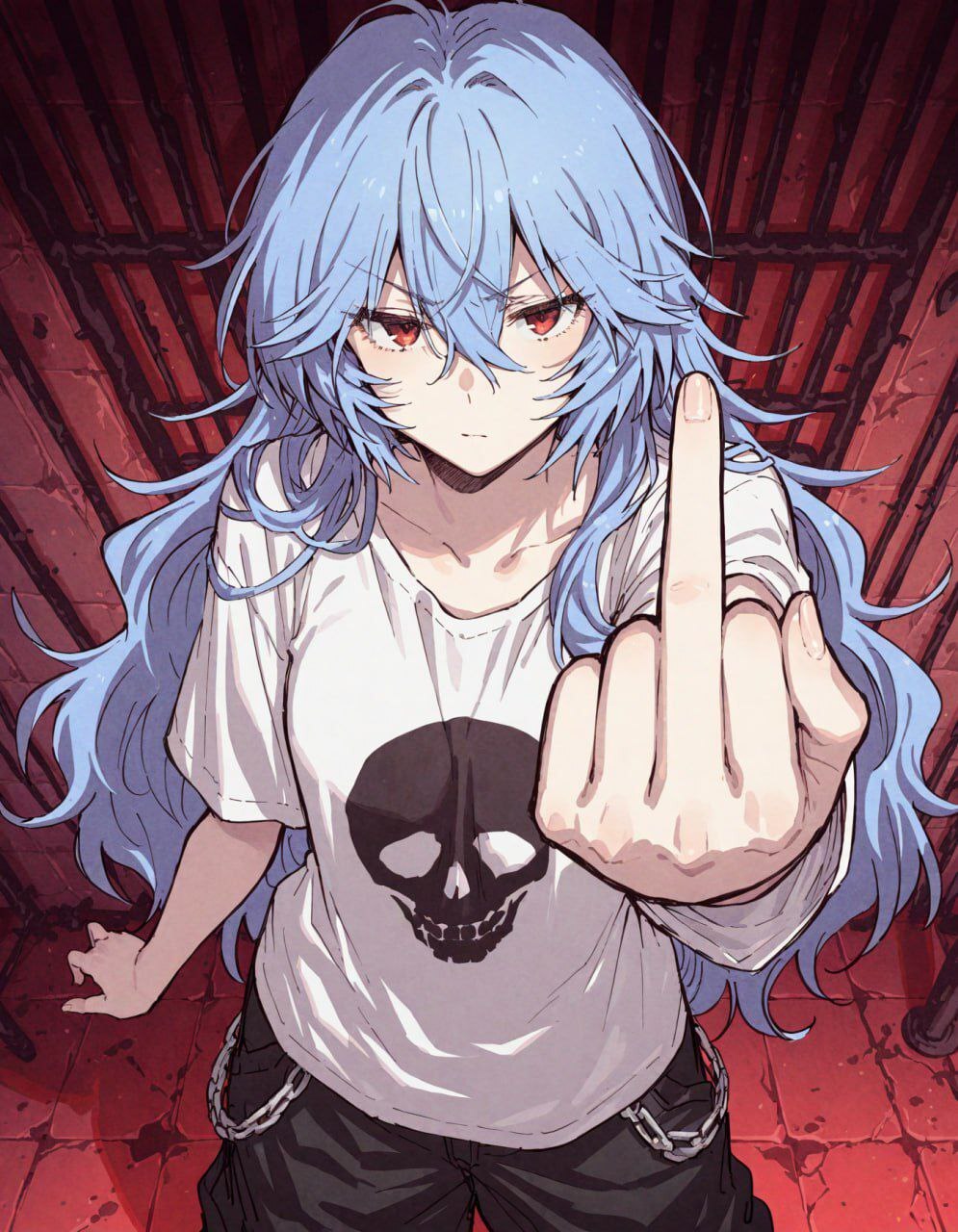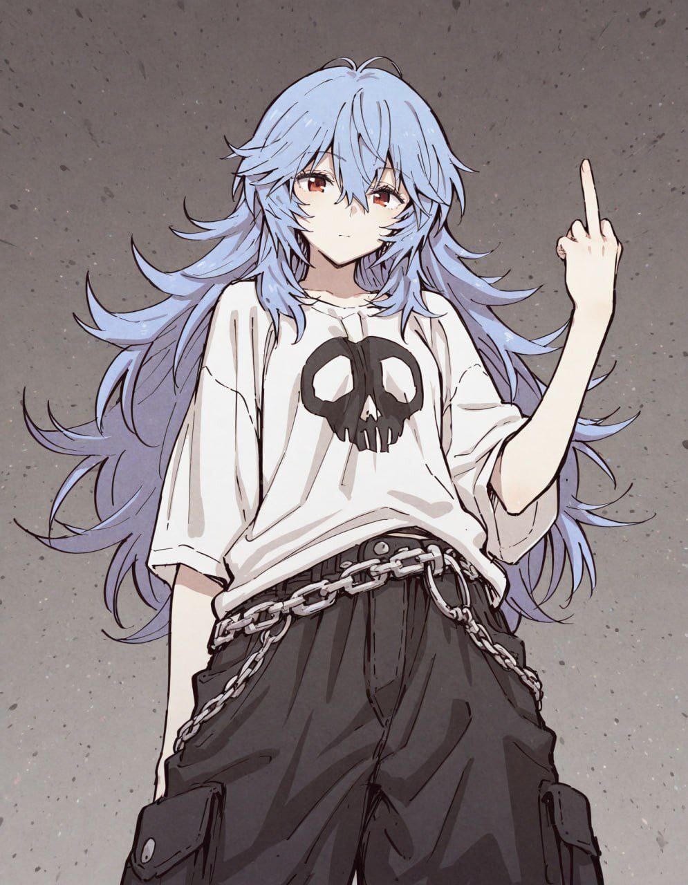Девушка с длинными распущенными голубыми волосами и алыми, словно кровь, глазами, ничего не ответила, продолжая не мигая смотреть на меня. Она была одета в белую длинную футболку с принтом черепа и мешковатые чёрные штаны, на поясе которых поблёскивала цепь.