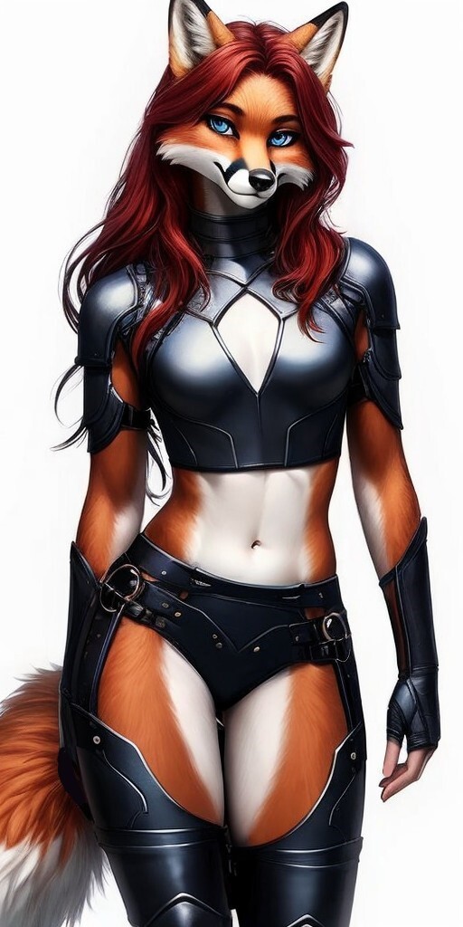 Вытянутая лисья морда несмотря на звериный облик тем не менее имела отчётливые человеческие черты и была обрамлена средней длины красными волосами сквозь которые торчали кверху большие острые уши. Плечи, бока, руки и внешние стороны бёдер оборотня покрывала рыжая шерсть в то время как живот, грудь и внутренние части бёдер щеголяли чистой белой кожей. Облачена лисица была в открытый доспех из кожи и металлических заклёпок едва прикрывающий наиболее провокационные места — крайне практичный и удобный костюм как для оборотня способного трансформировать своё тело меняя его форму.