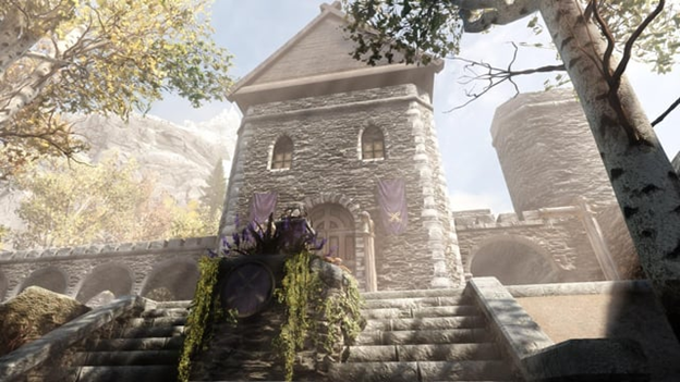 Собственно, чтобы попасть на «верхний рынок», как звали его горожане, достаточно было перейти один из трёх мостов, соединяющих разные части города с платформой. Но вот чтобы спуститься вниз, к «нижнему рынку», нужно было пройти до одного из концов «полумесяца», в форме которого был выстроен наземный город. Центральный и единственный официальный вход в Рифтен был на одном его конце, а резиденция Ярла, Миствейл — на другом. И так уж совпало, что нужная нам лестница оказалась к нам же и ближайшей!