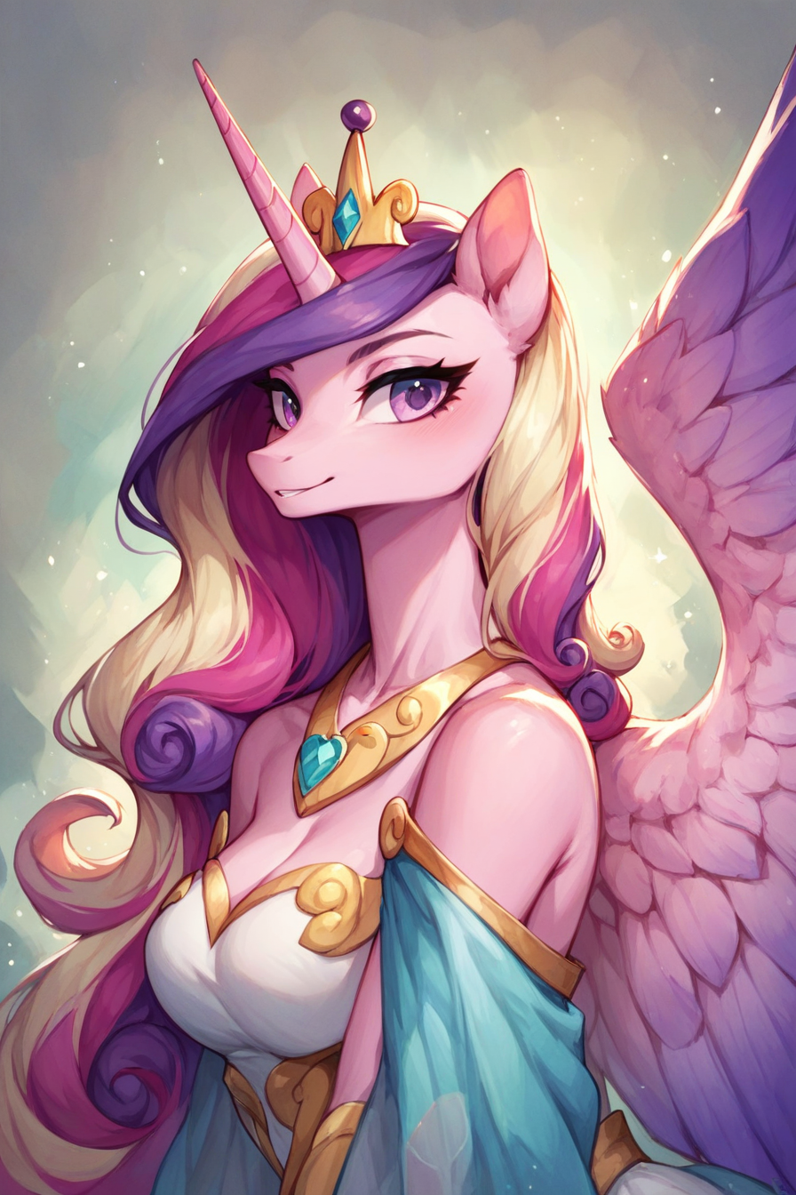 Ухоженные волосы гривы, на которой располагалась небольшая церемониальная корона с синим кристаллом, за которыми Каденс проводит добрые полтора часа каждое утро, тонкие брови, чуть удлинённые ресницы, подчёркивающие фиолетовые глаза аликорна. Её лицо не вызывало той располагающей к себе "ауры", скорее при виде Каденс пони подумает о красоте Принцессы Любви, утончённой, о которой та тщательно заботиться, чем будет воспринимать ту всерьёз как равной Селестии. Каденс не раз жаловалась на это Спайку, что каким-то образом стал личным психологом той, едва ли не покупая той напитки и еду, когда та приглашала его в свои покои "поработать".