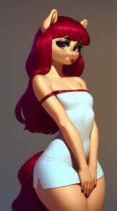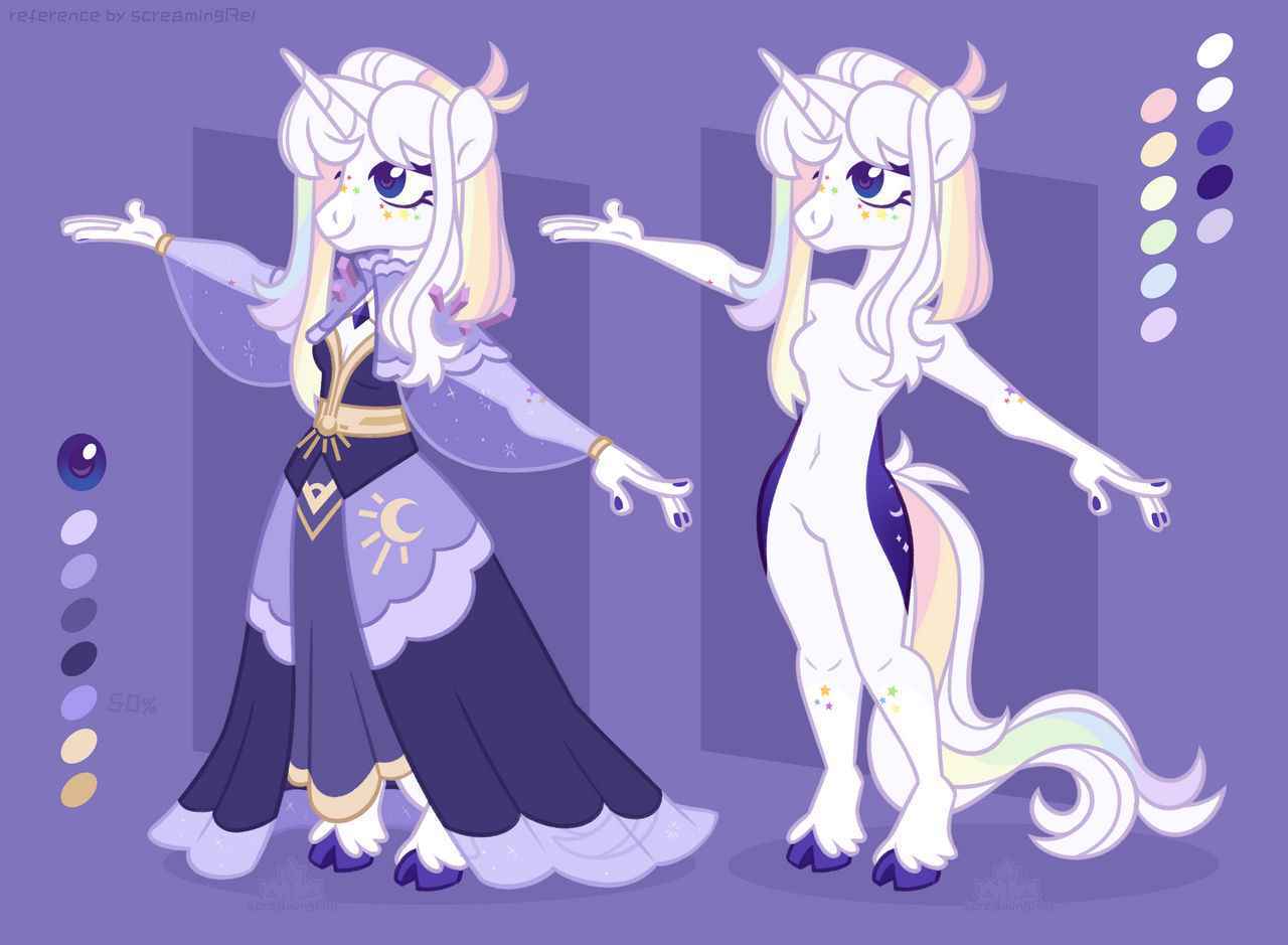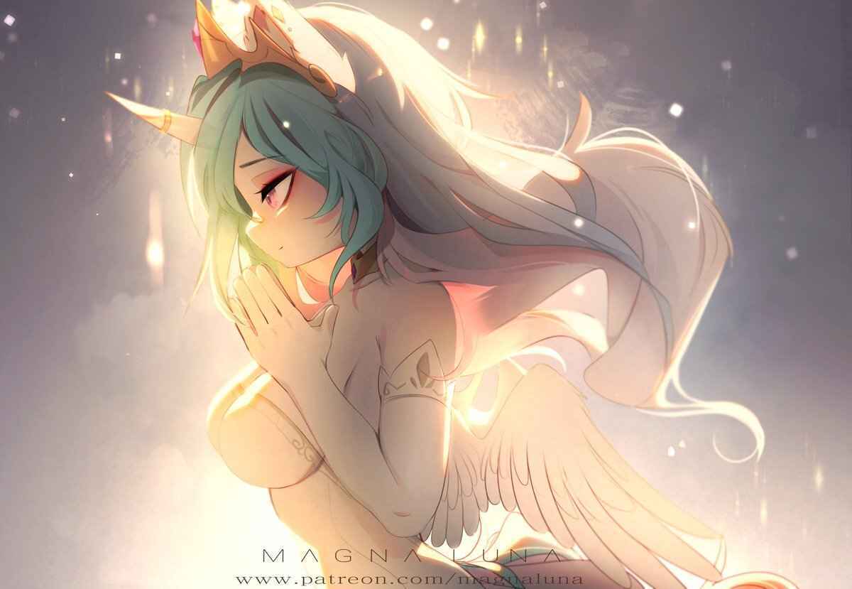 Принцесса Солнца. Правитель Эквестрии, известная своей небесной красотой, статной фигурой, что лишь слегка прибавила в бёдрах за последний век, выдающейся грудью, широкими бёдрами, стройными ногами и прекрасной мордочкой, с мягкими губами и волшебно фиолетовыми глазами. Развивающая на "невидимом ветру" радужная грива, полная магии, ухоженный и пушистый белый мех, украшаемый кьютимаркой Солнца на бёдрах, большие магические крылья, могущие творить множество древних заклинаний самого Звёздоборода, идущие лишь за величественным белым рогом, что отлично дополняет золотую корону, добавляясь к символу власти как её часть.